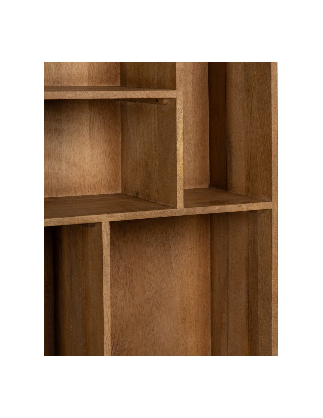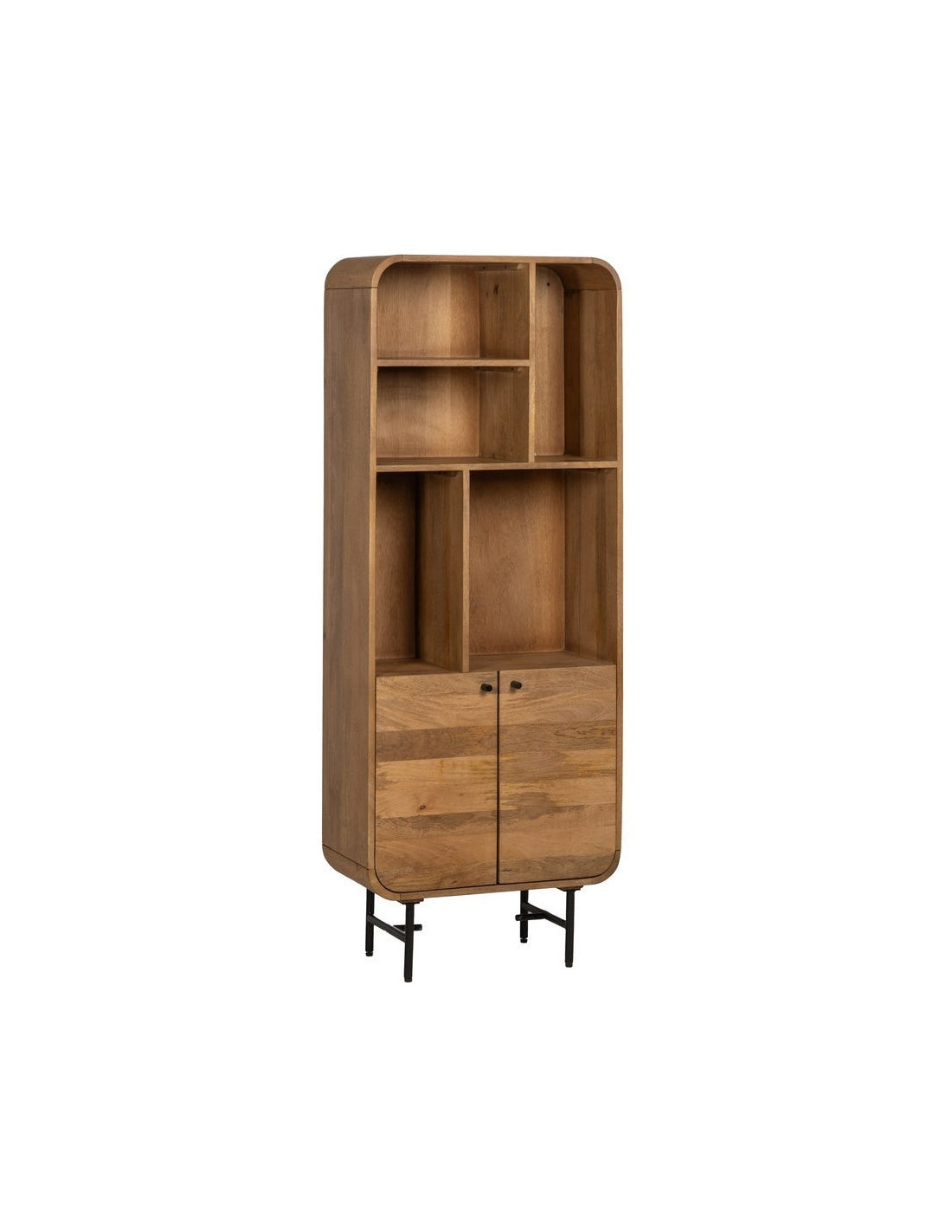 Ses cinq niches ouvertes accueillent livres, objets décoratifs ou pièces singulières. L’asymétrie des espaces casse la rigidité classique et permet une composition plus libre. En partie basse, les deux portes dissimulent ce que vous préférez garder hors de vue, pour un rendu toujours équilibré.
