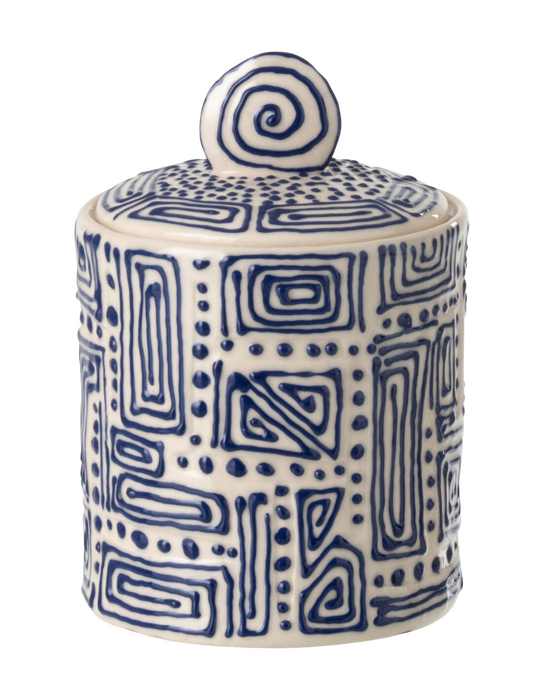 Boite déco ethnique chic avec couvercle 12 cm Céramique Blanc cassé Bleu foncé Labyria