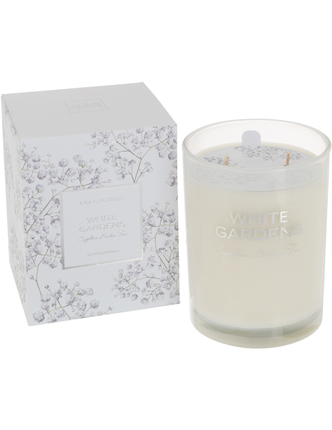 Bougie parfumée XL Florale 70 heures White Garden Parfum Sapphire Amber Tea avec photophore en Verre