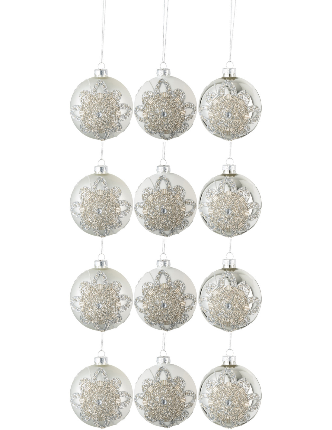 Boule de Noël en Verre Argenté Motif fleur Avec perles (Lot de 12)