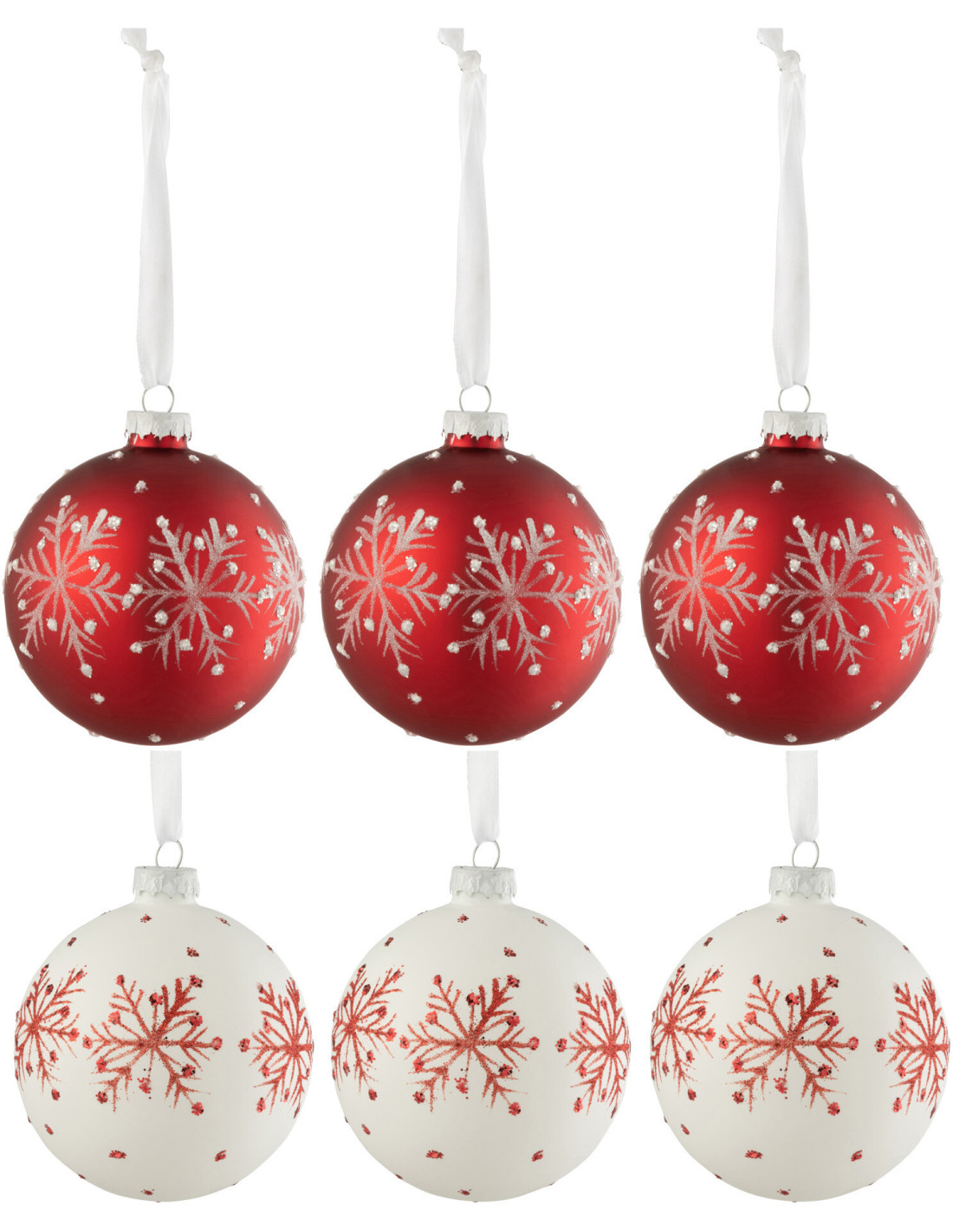 Boule de Noël en Verre Blanc Rouge Motif flocons (Lot de 6)