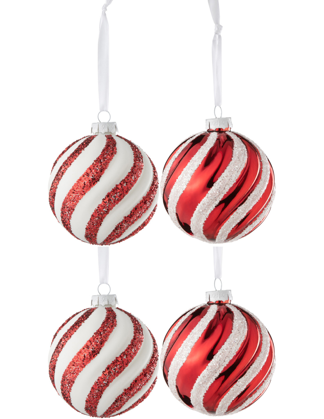 Boule de Noël en Verre Blanc Rouge motif Lignes Avec paillettes (Lot de 4)