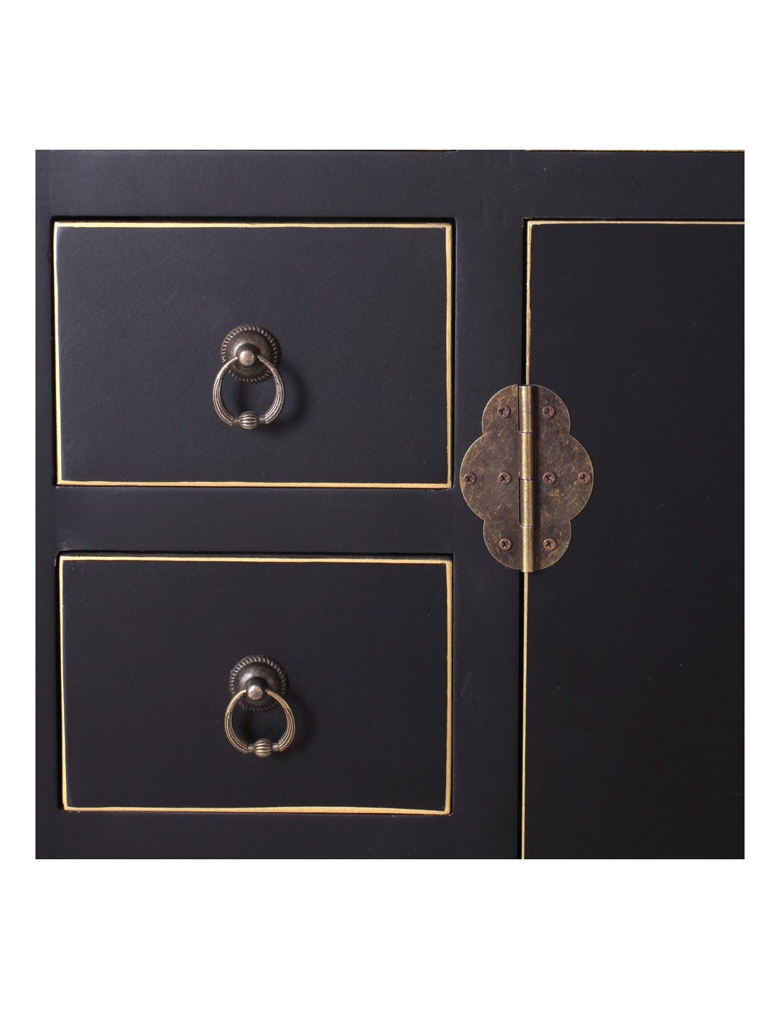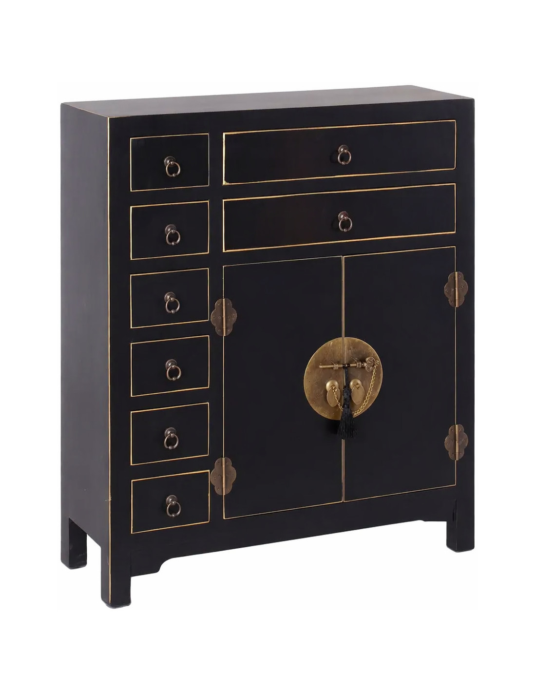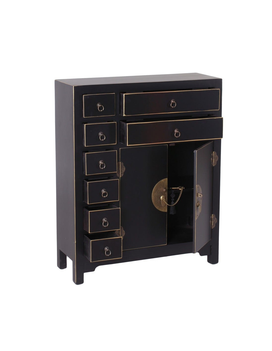 Inspiré des anciens meubles d’herboristerie asiatique, ce buffet apothicaire incarne une esthétique forte, presque théâtrale. Son noir profond agit comme une toile de fond sophistiquée, subtilement soulignée par des lignes dorées qui structurent chaque façade. Le regard est immédiatement capté par son fermoir circulaire en métal, véritable signature visuelle.