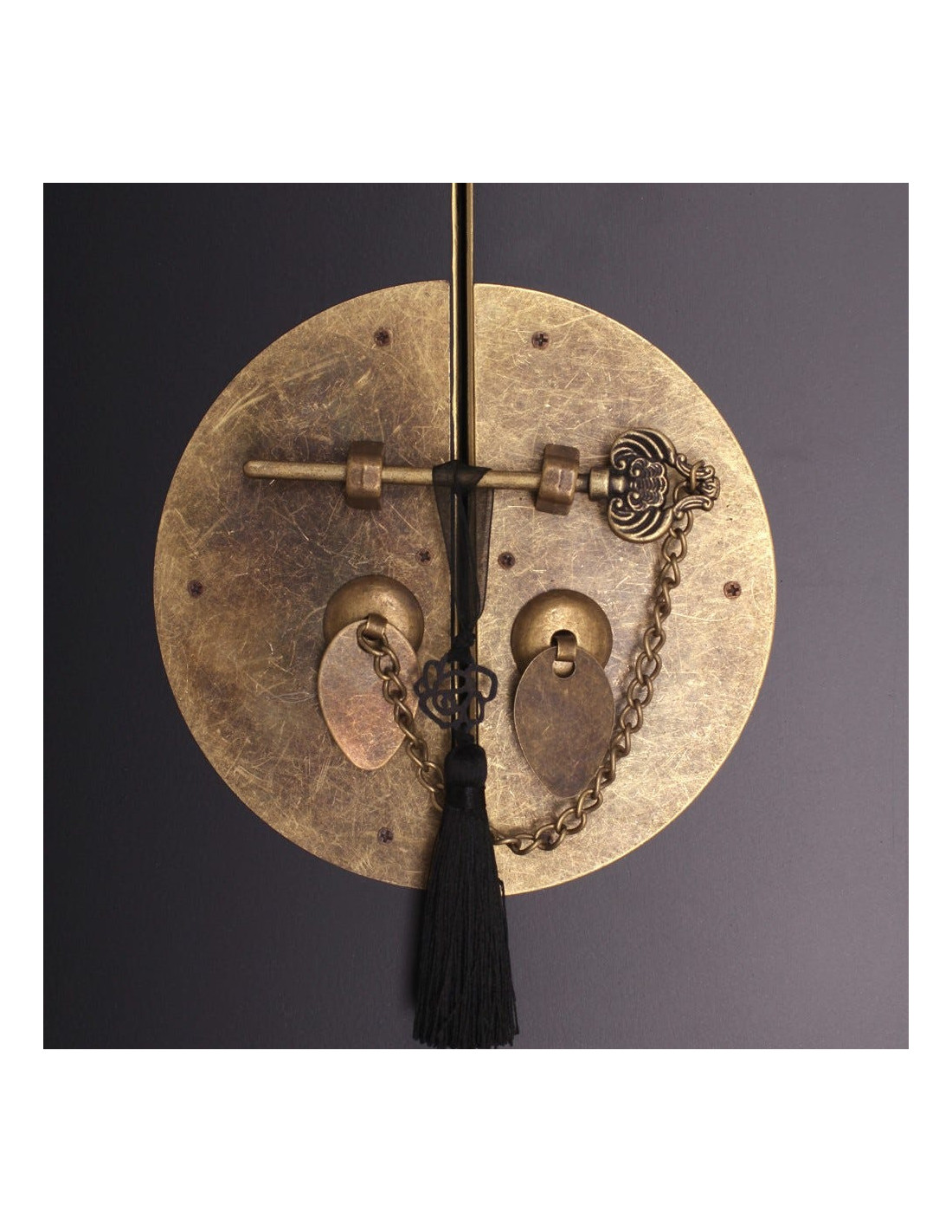 Chaque détail évoque un savoir-faire décoratif précis. Les poignées en anneaux métalliques, les charnières apparentes et le système de fermeture central apportent une dimension authentique et décorative. Le contraste entre la structure sombre et les éléments métalliques patinés crée un équilibre visuel à la fois élégant et affirmé.