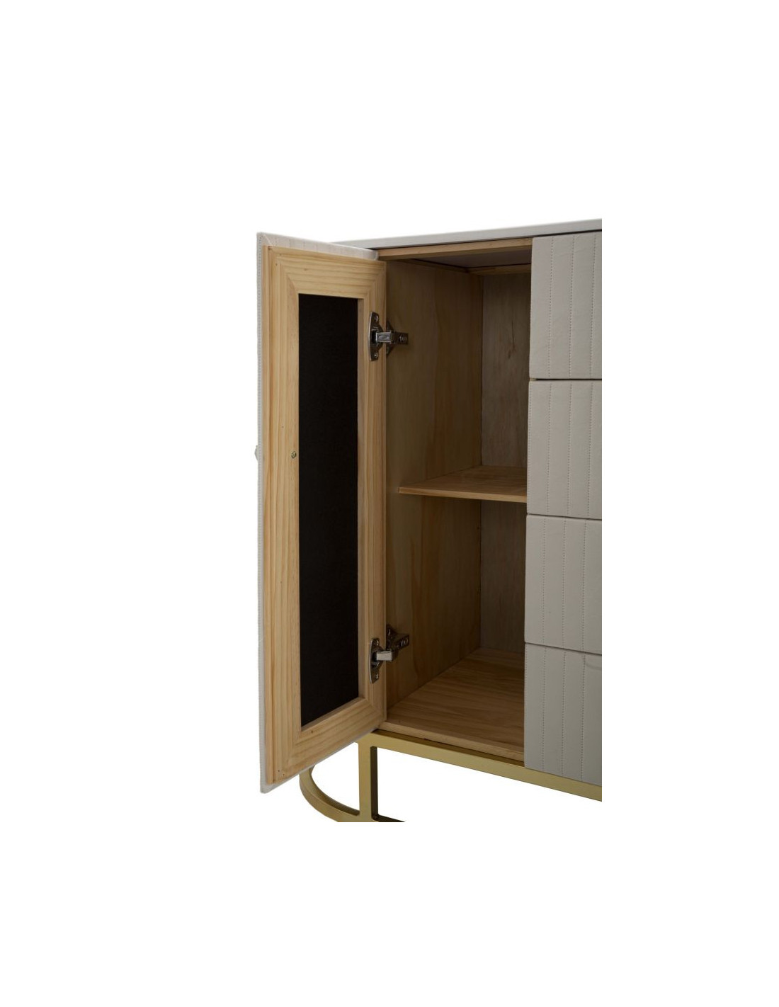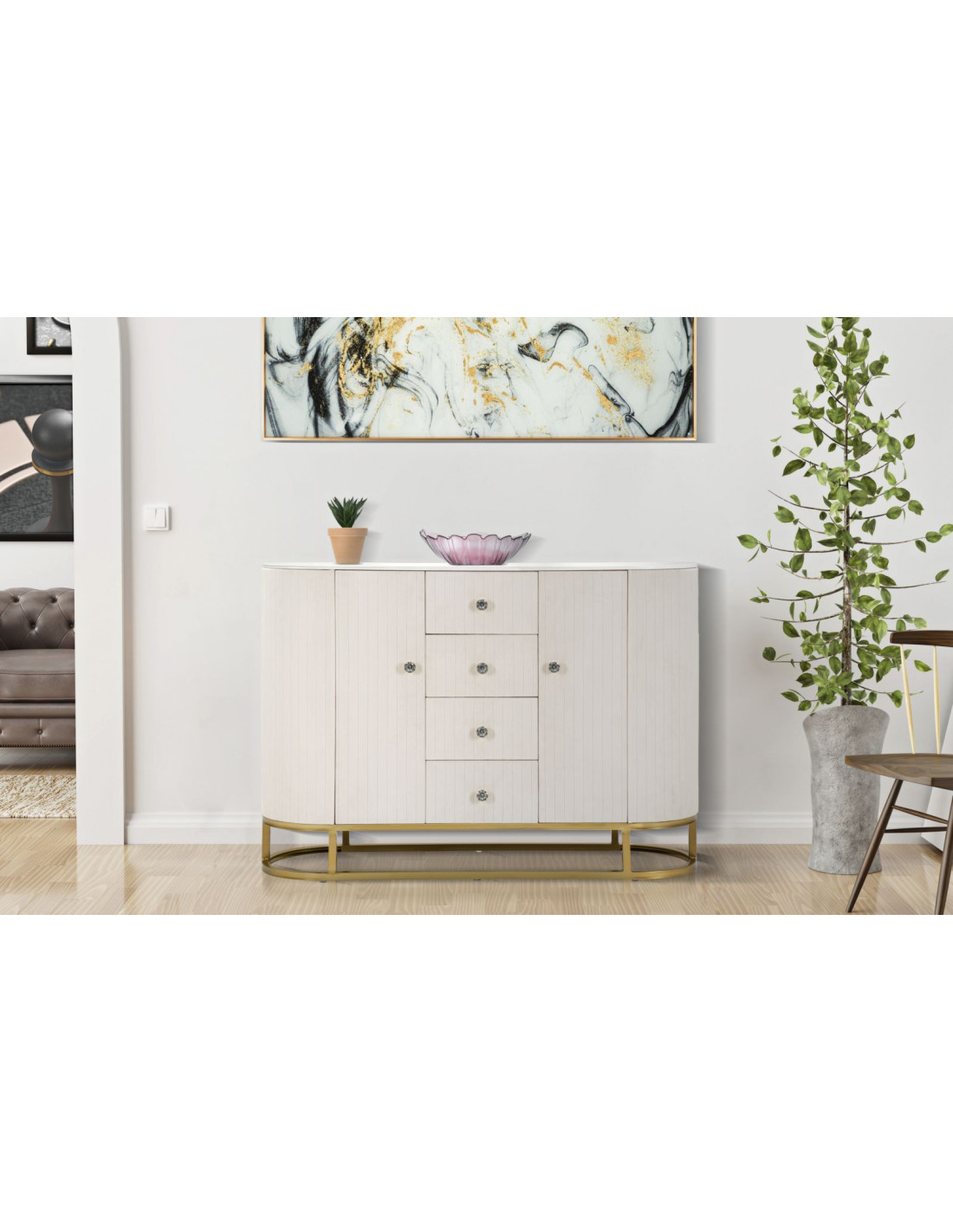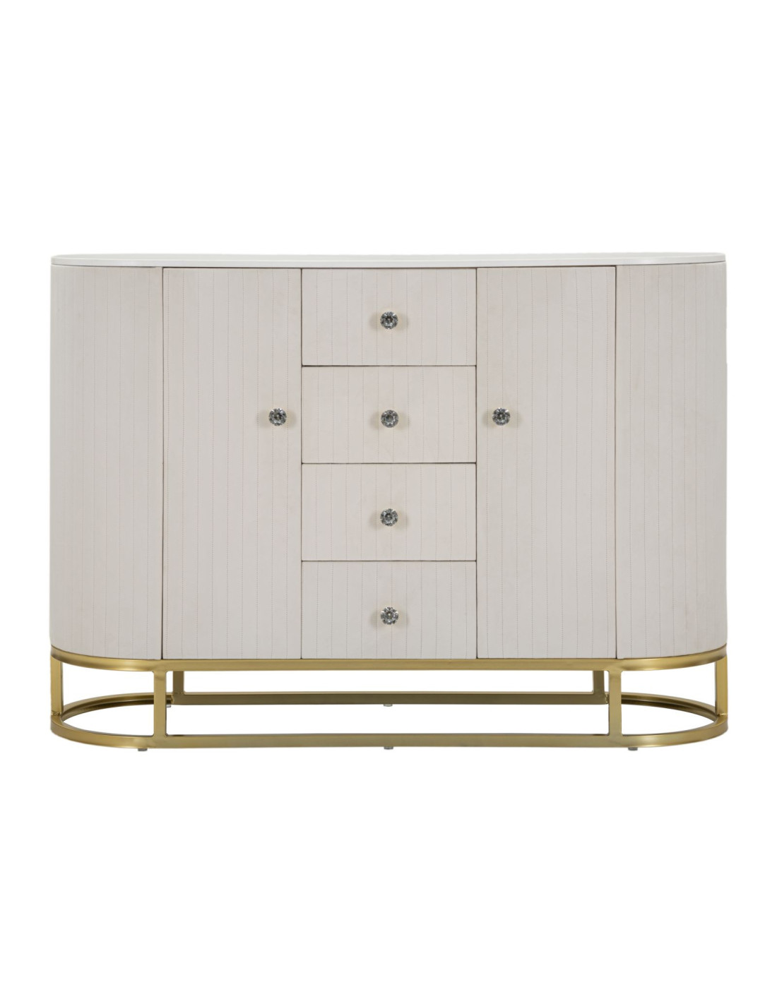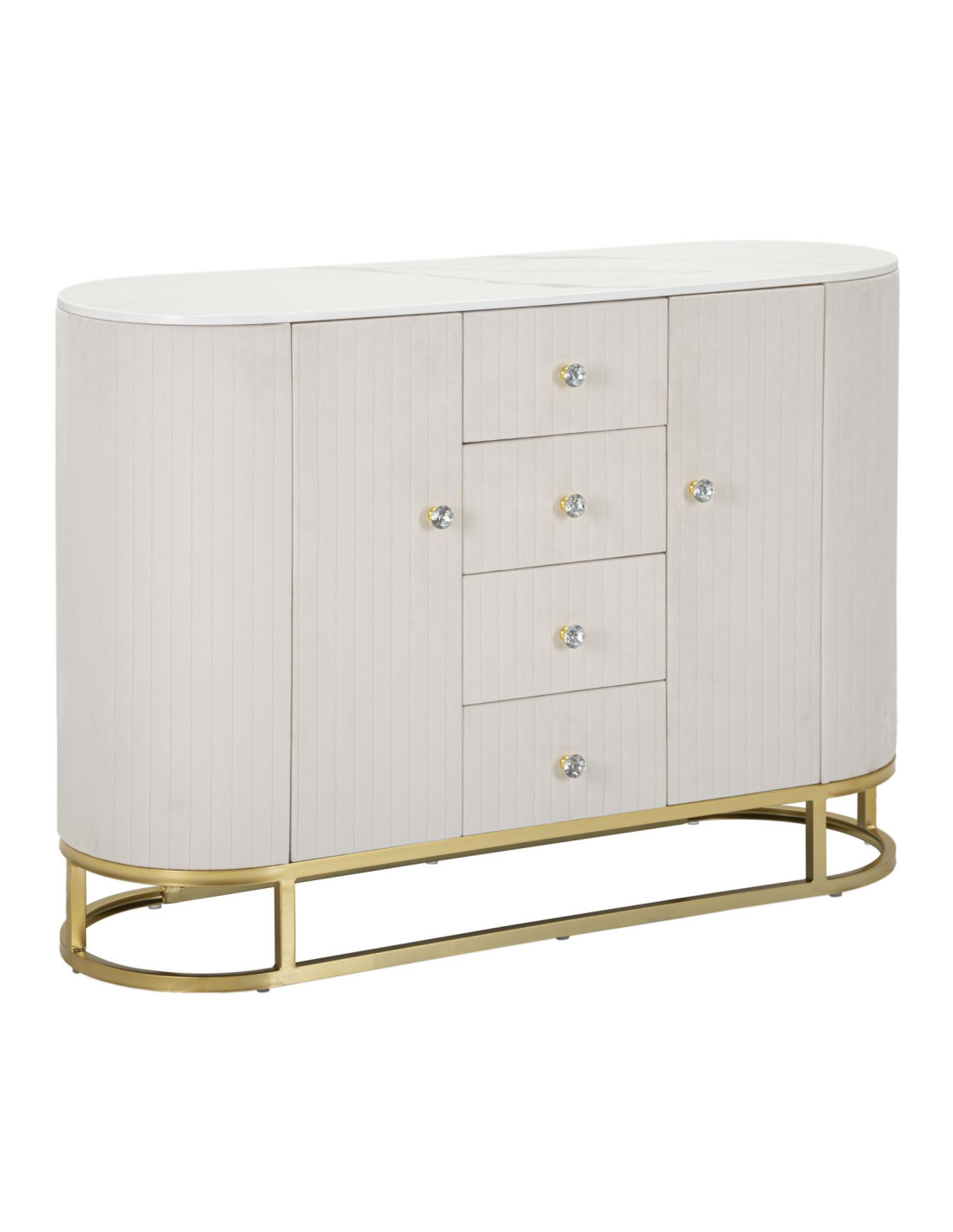 Buffet moderne Bas 2 portes 4 tiroirs en Velours Blanc crème Métal Doré Bois de pin Blanc Effet marbre Montpellier