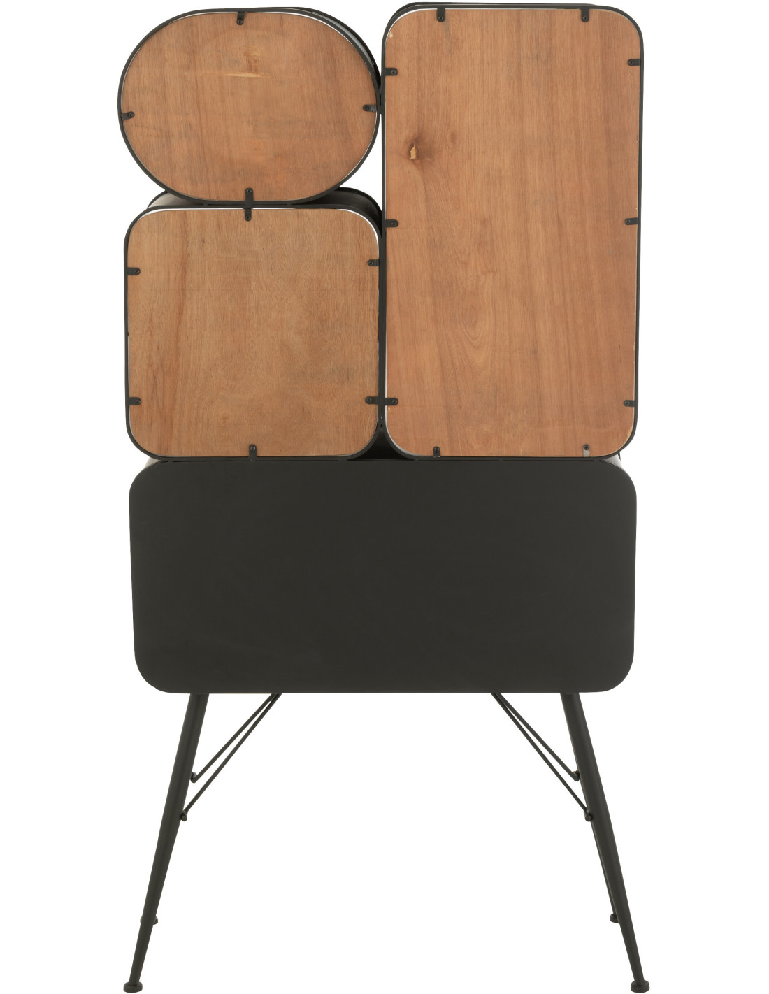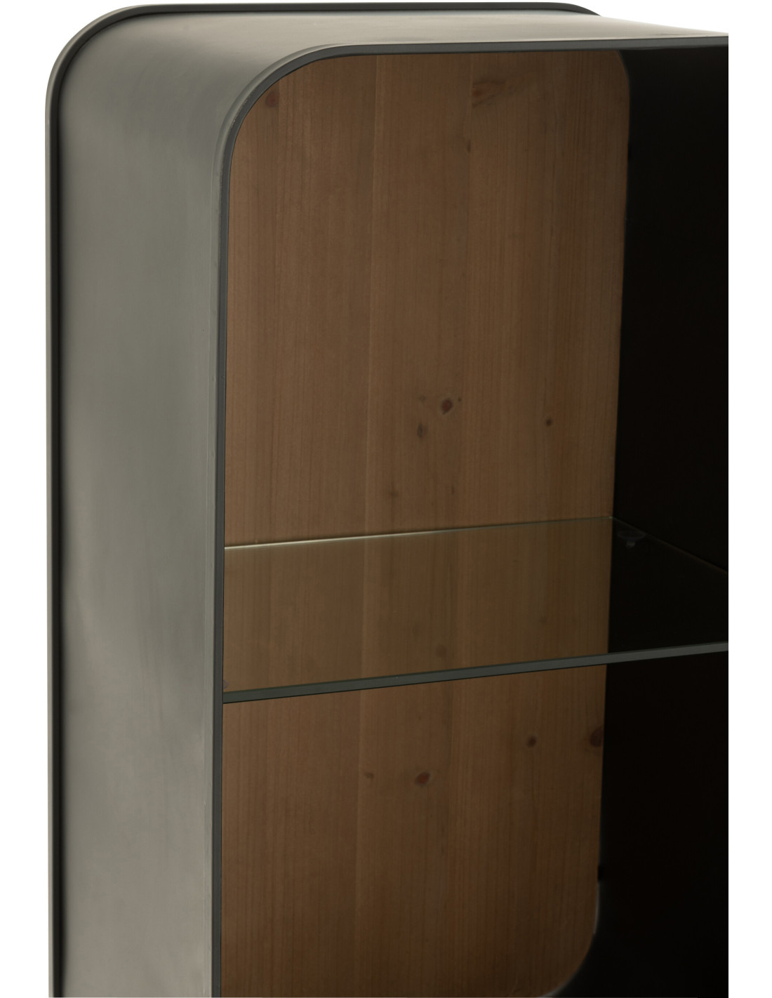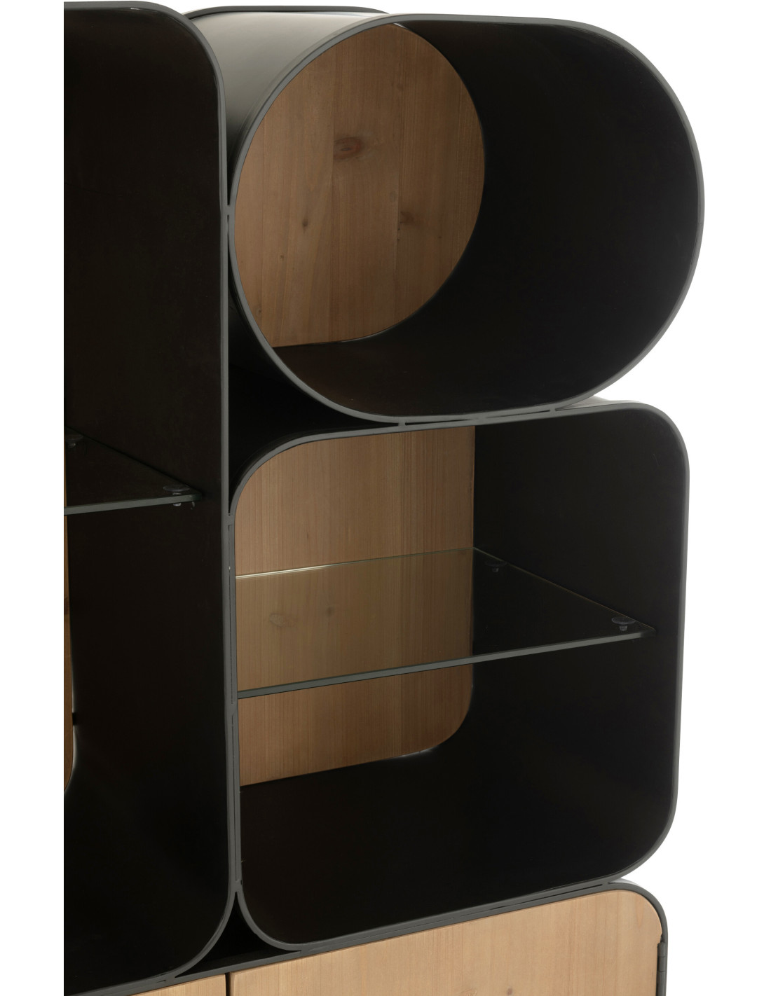 Buffet moderne Haut Arrondi 2 portes 5 étagères en Bois de sapin Naturel Métal Noir Verre Transparent Courchevel