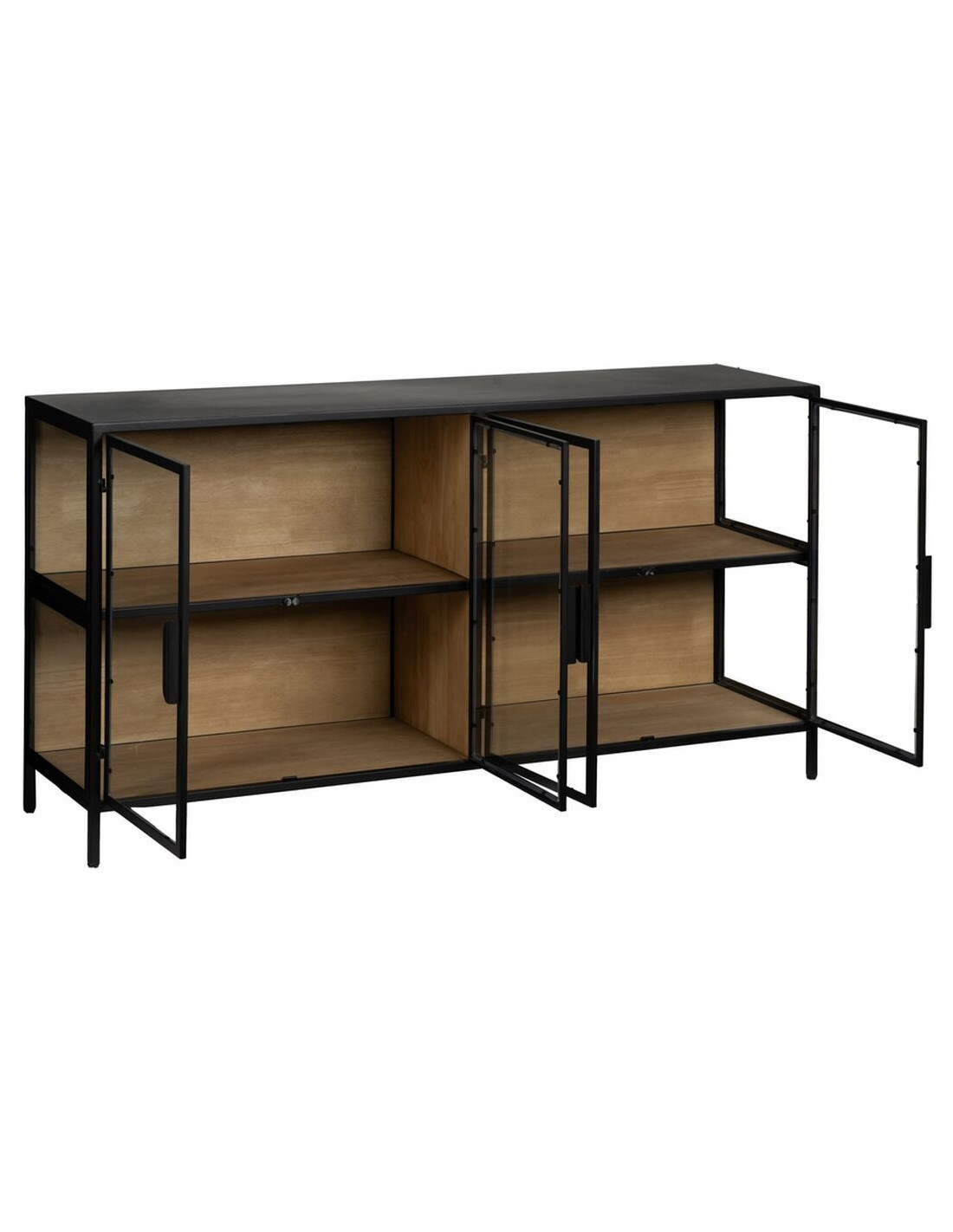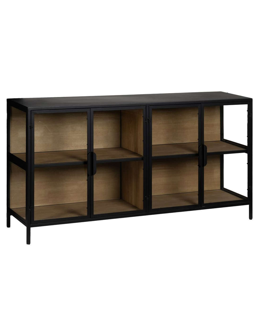 Buffet Vitrine industriel chic Bas 4 portes en Verre Transparent Métal Noir Bois MDF Naturel Barbate