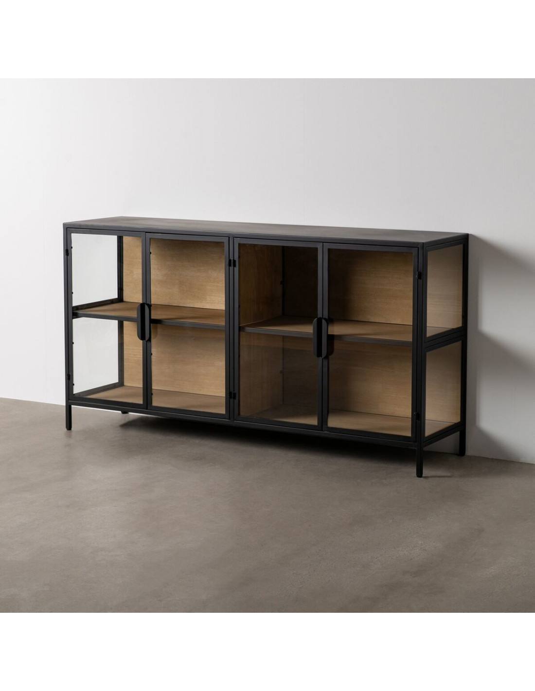 Buffet Vitrine industriel chic Bas 4 portes en Verre Transparent Métal Noir Bois MDF Naturel Barbate - 1