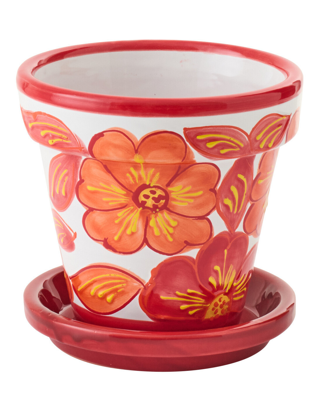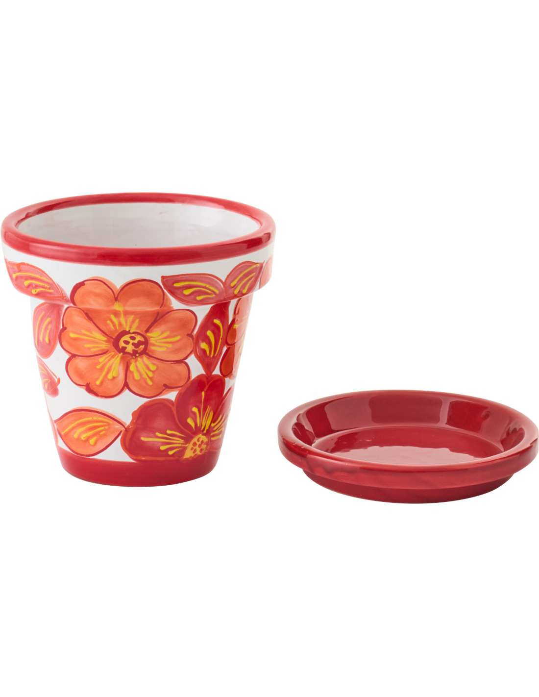 Cache-pot avec soucoupe style bohème folk Rond D 21 cm Céramique Orange Blanc Motif fleurs Flowfolk