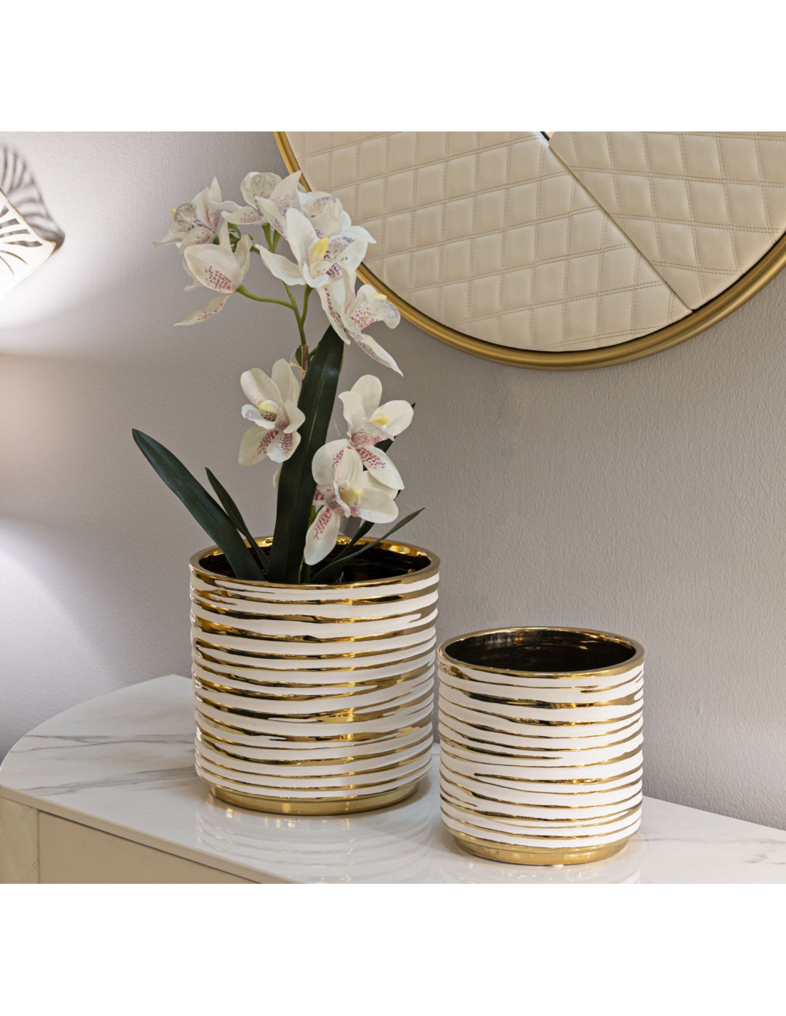 Cache-pot moderne Rond en Céramique Doré Blanc Blom (Lot de 2)