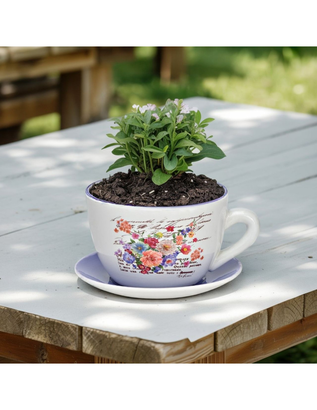 Cache-pot Tasse shabby chic 25 cm Céramique Blanc Lilas Motif fleurs Dayon - 1