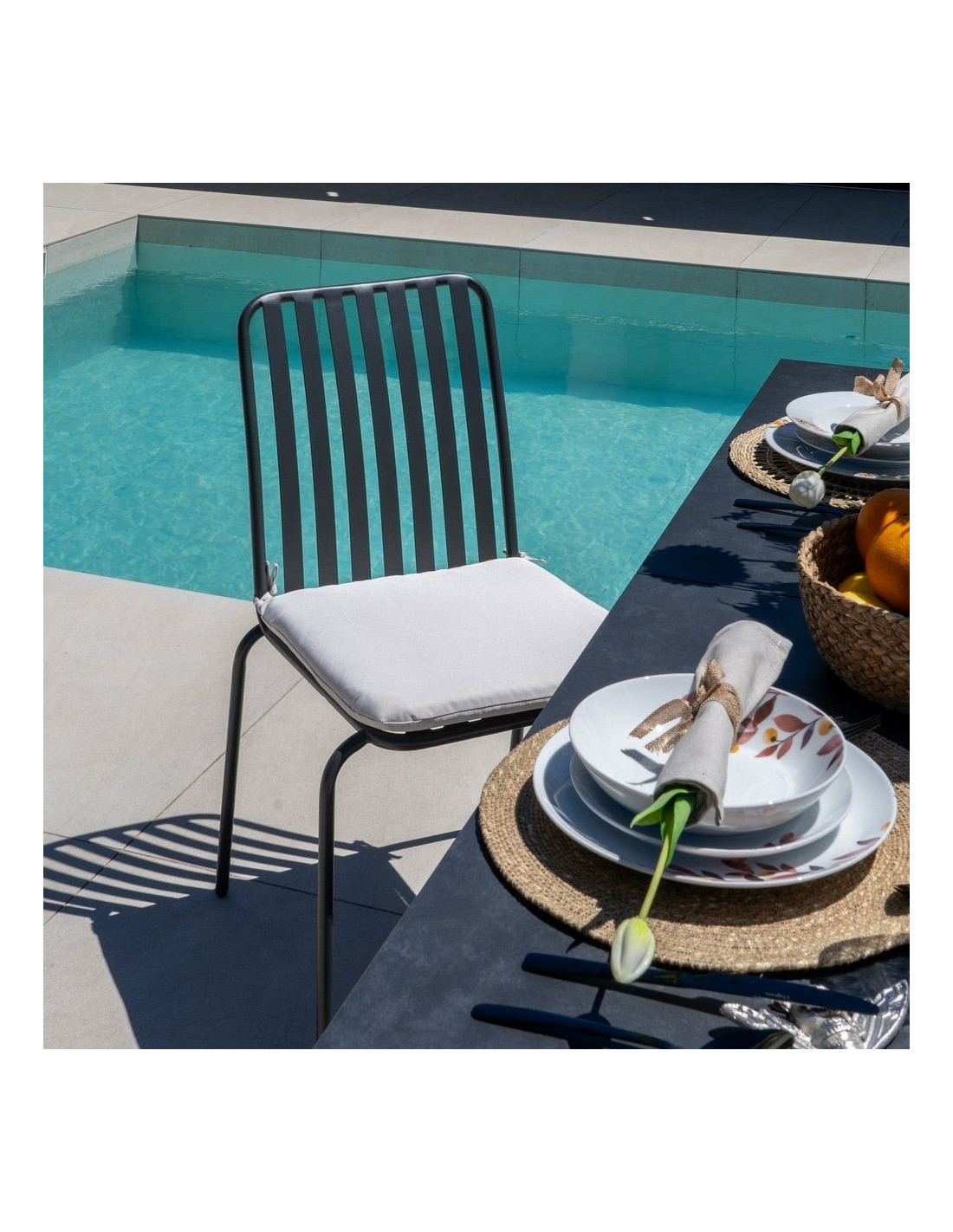 Le coussin d’assise apporte un confort immédiat, idéal pour prolonger les repas ou les moments de détente. Les dimensions équilibrées permettent une assise stable et agréable.