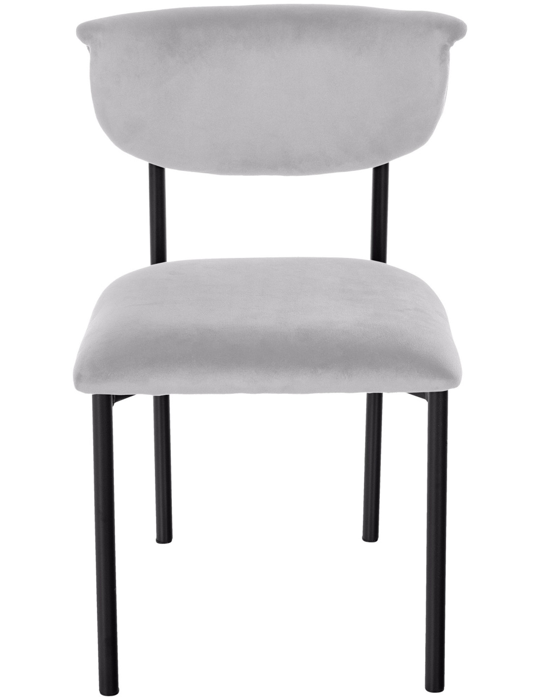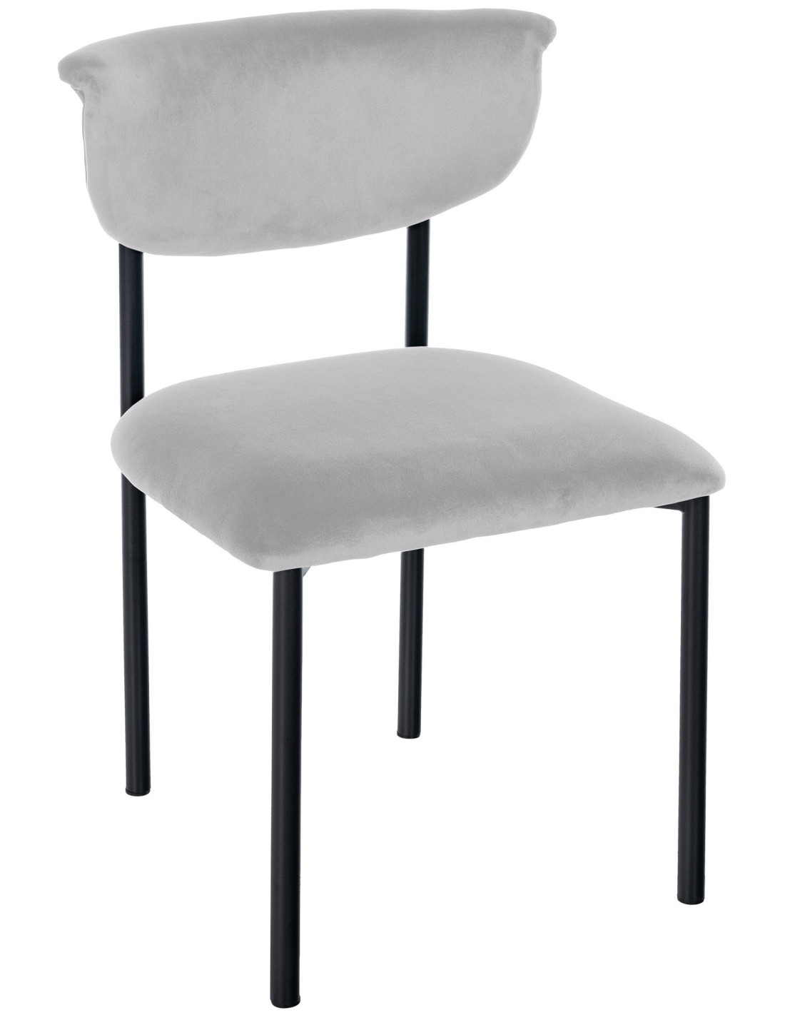 Une chaise qui joue la carte de la douceur. Mareo associe un velours gris lumineux à une structure fine en métal noir pour créer une assise élégante, confortable et facile à intégrer.