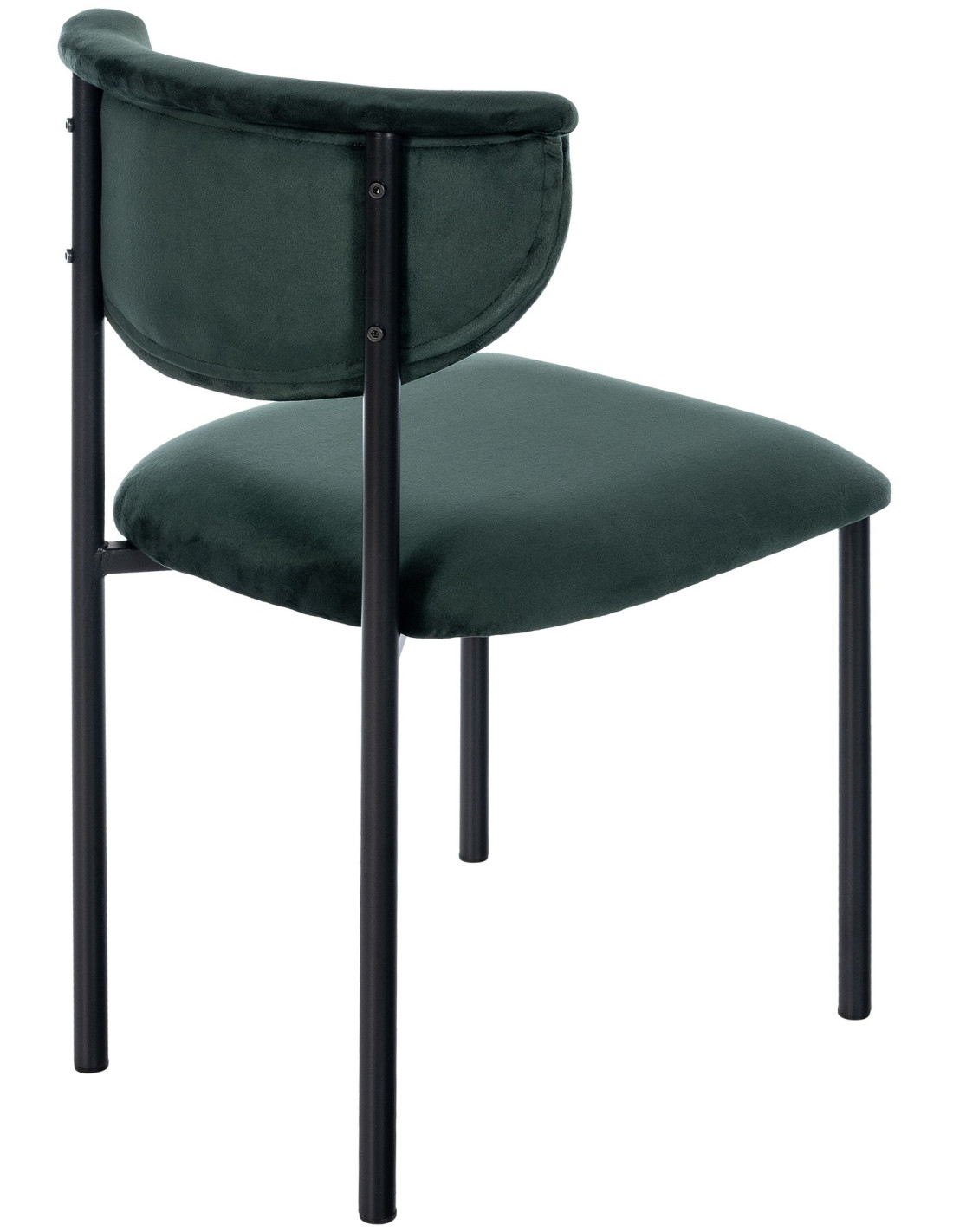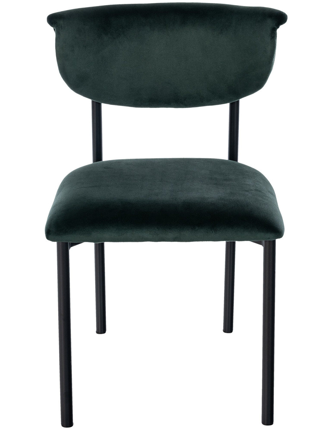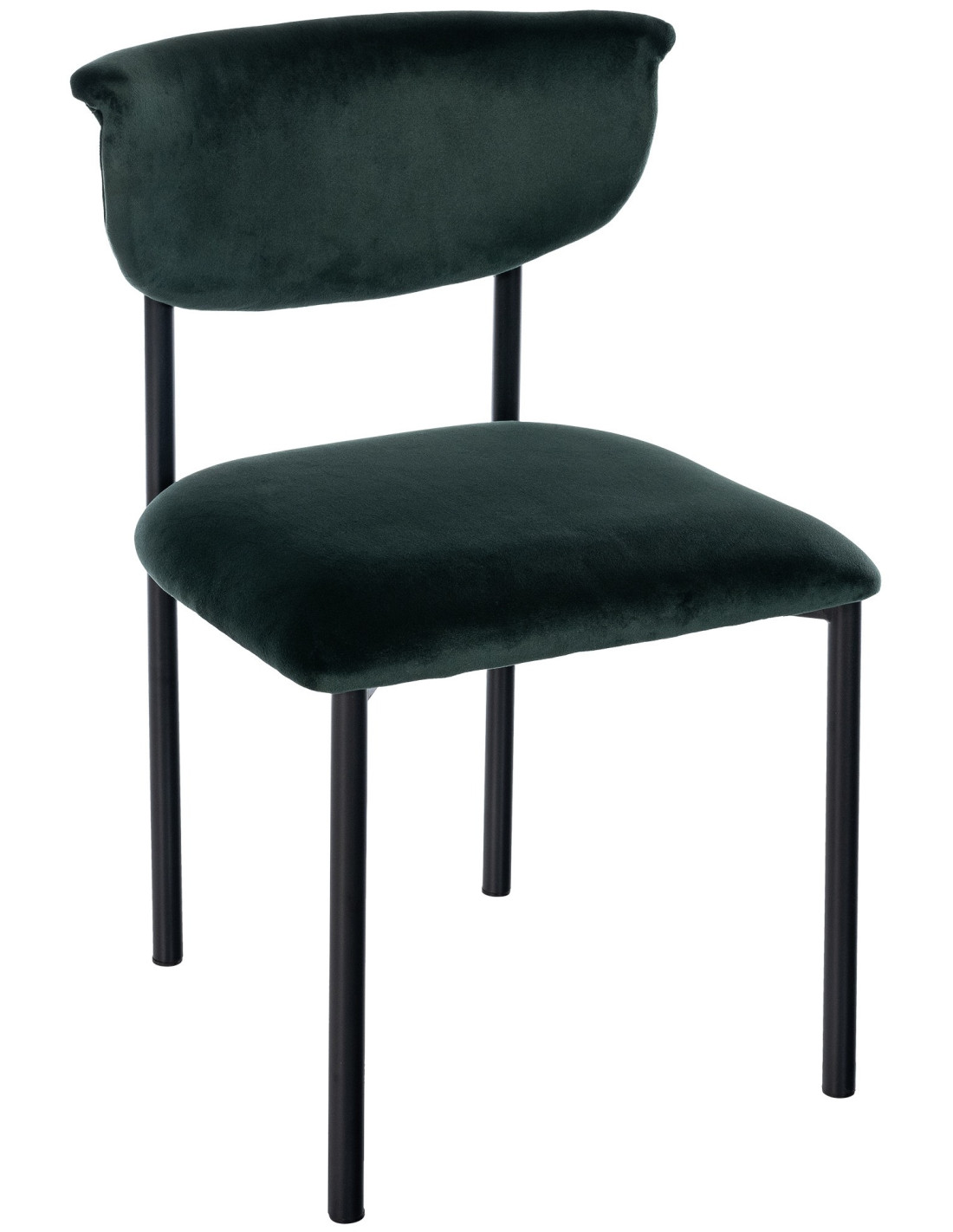 La chaise Mareo en velours vert foncé joue sur un contraste subtil entre profondeur et légèreté. Le tissu dense capte la lumière et révèle des nuances riches, tandis que la structure en métal noir apporte une ligne fine et équilibrée.
