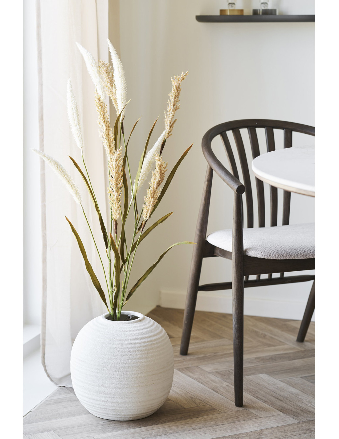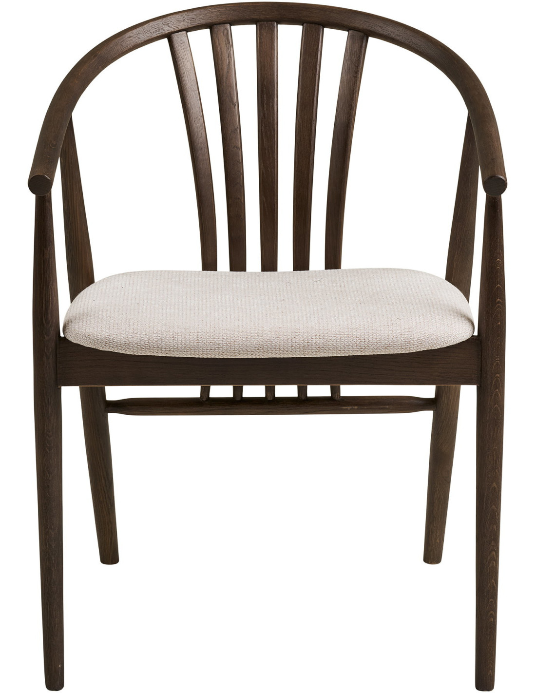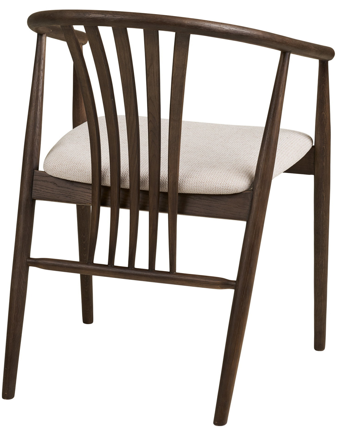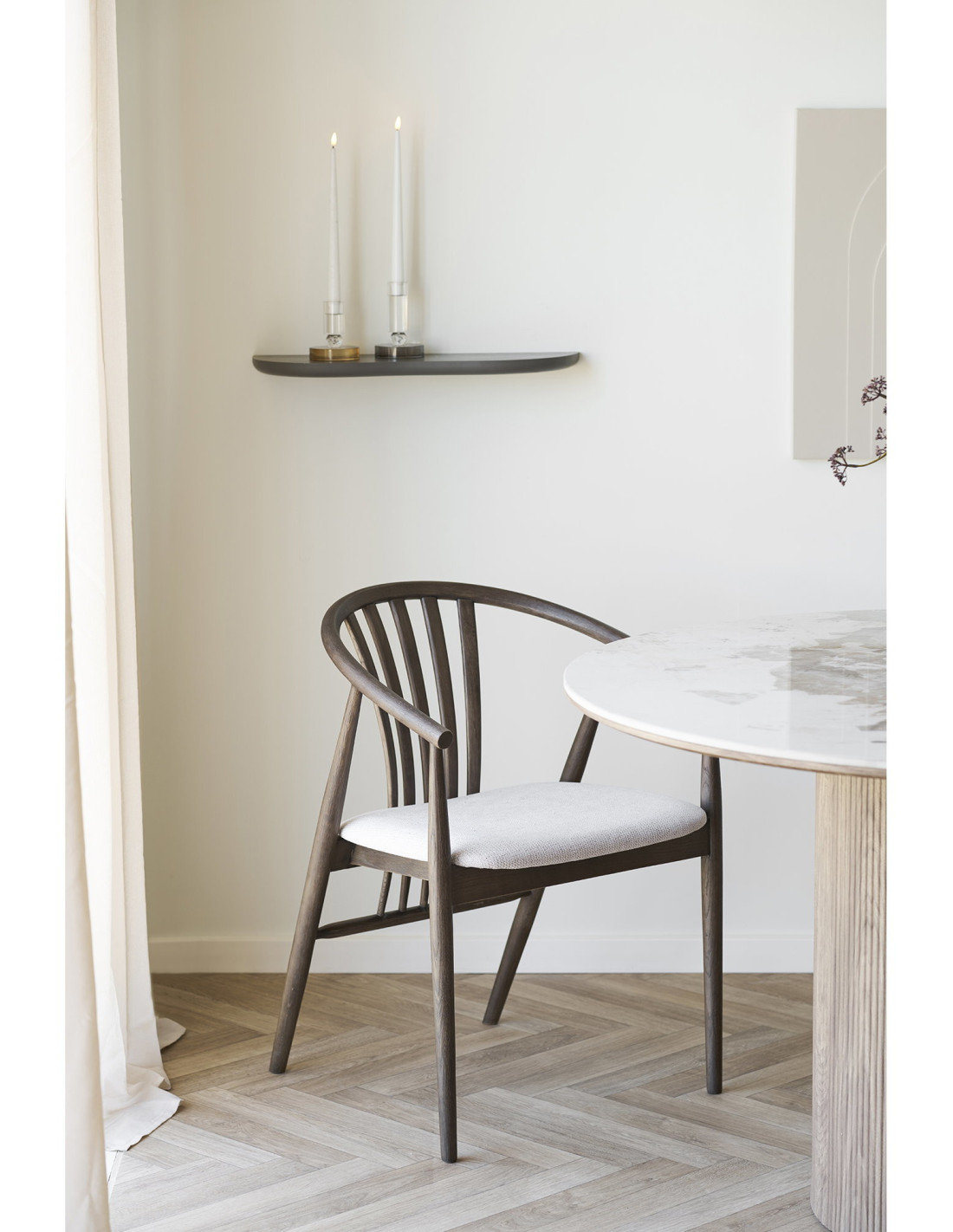 Le chêne fumé donne à la chaise une tonalité plus profonde, avec des nuances brunes riches qui renforcent sa présence. Cette finition met en valeur les lignes du bois et accentue le dessin du dossier.