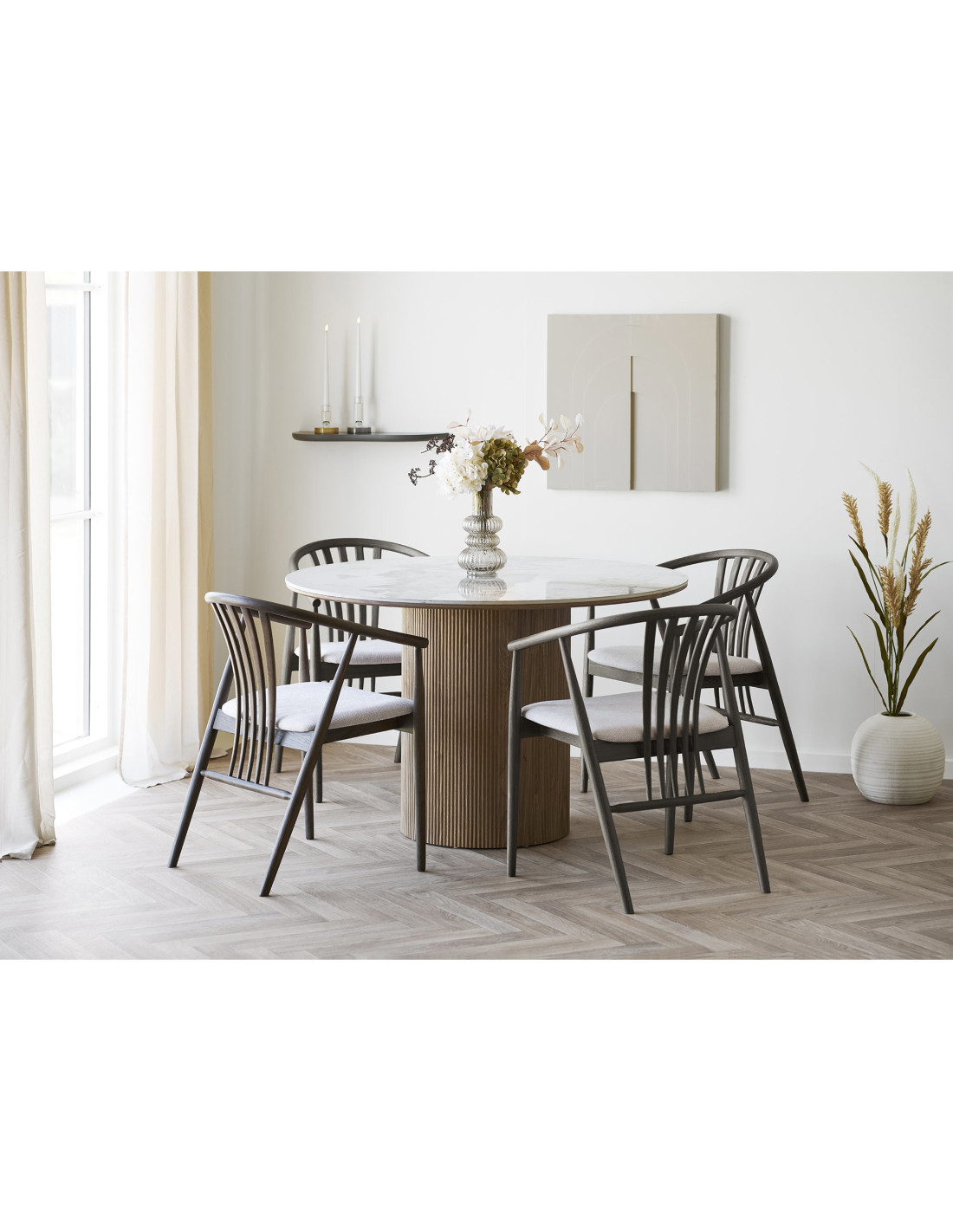 La chaise Agustin en chêne fumé s'adapte aussi bien à des intérieurs contemporains qu'à des ambiances plus classiques. Elle peut être associée à des tables claires pour créer du contraste ou à des matériaux plus sombres pour renforcer une atmosphère enveloppante.