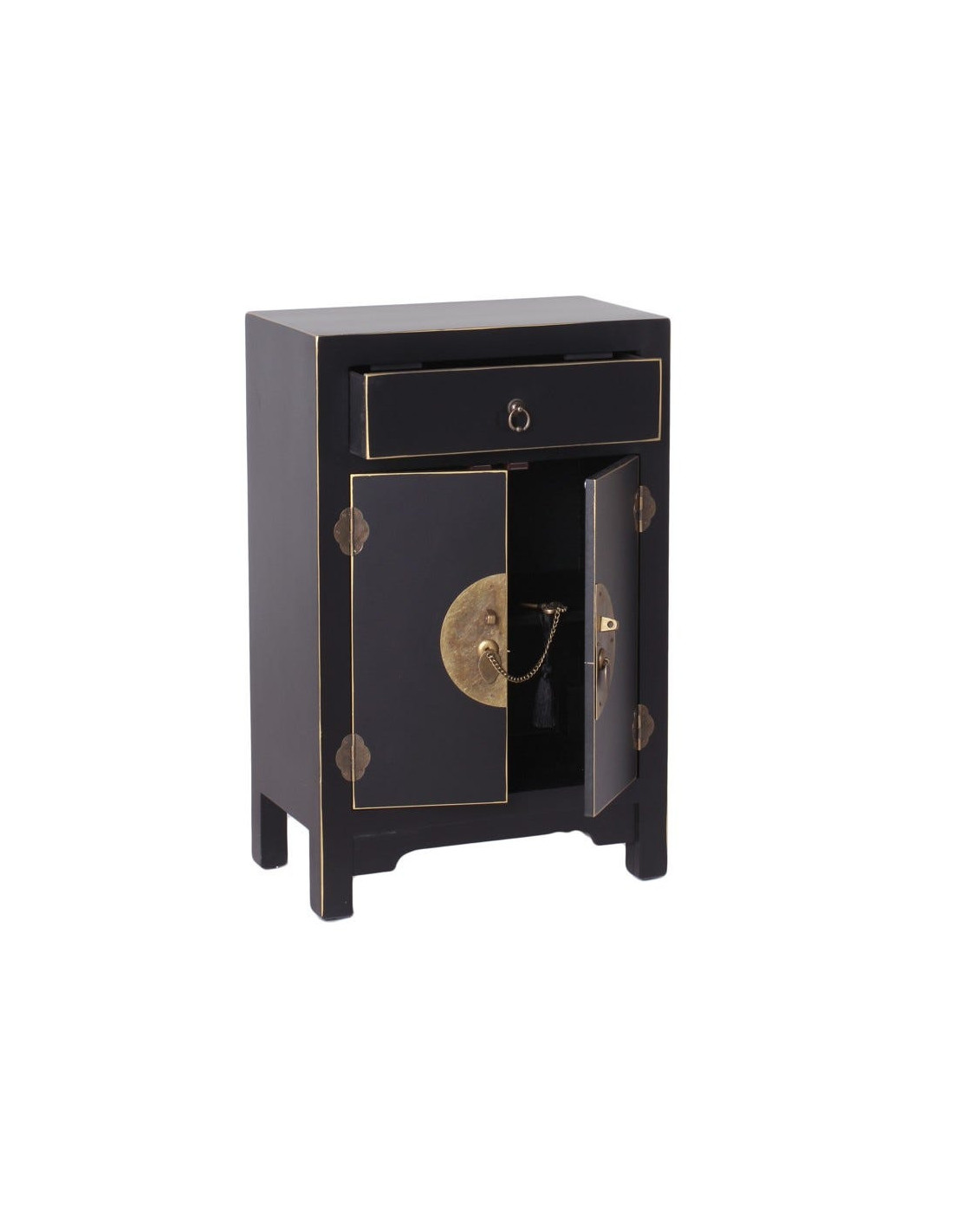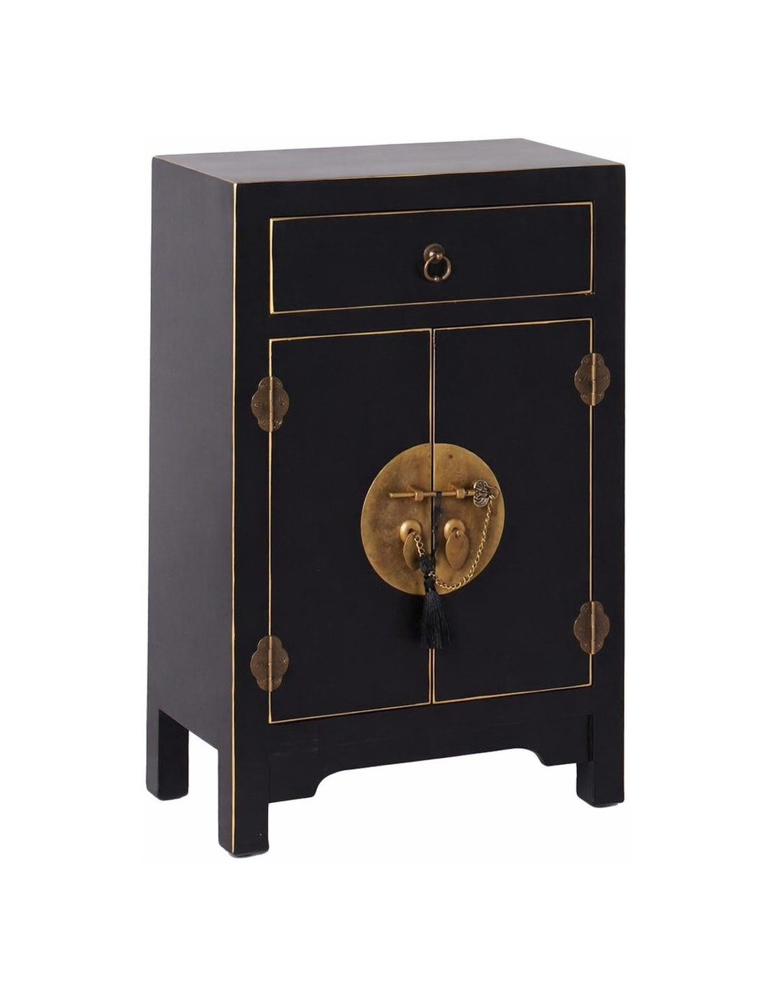 Une présence discrète mais remarquable. Cette table de chevet noire aux accents dorés revisite les codes asiatiques avec une élégance subtile, idéale pour structurer votre espace nuit avec style.