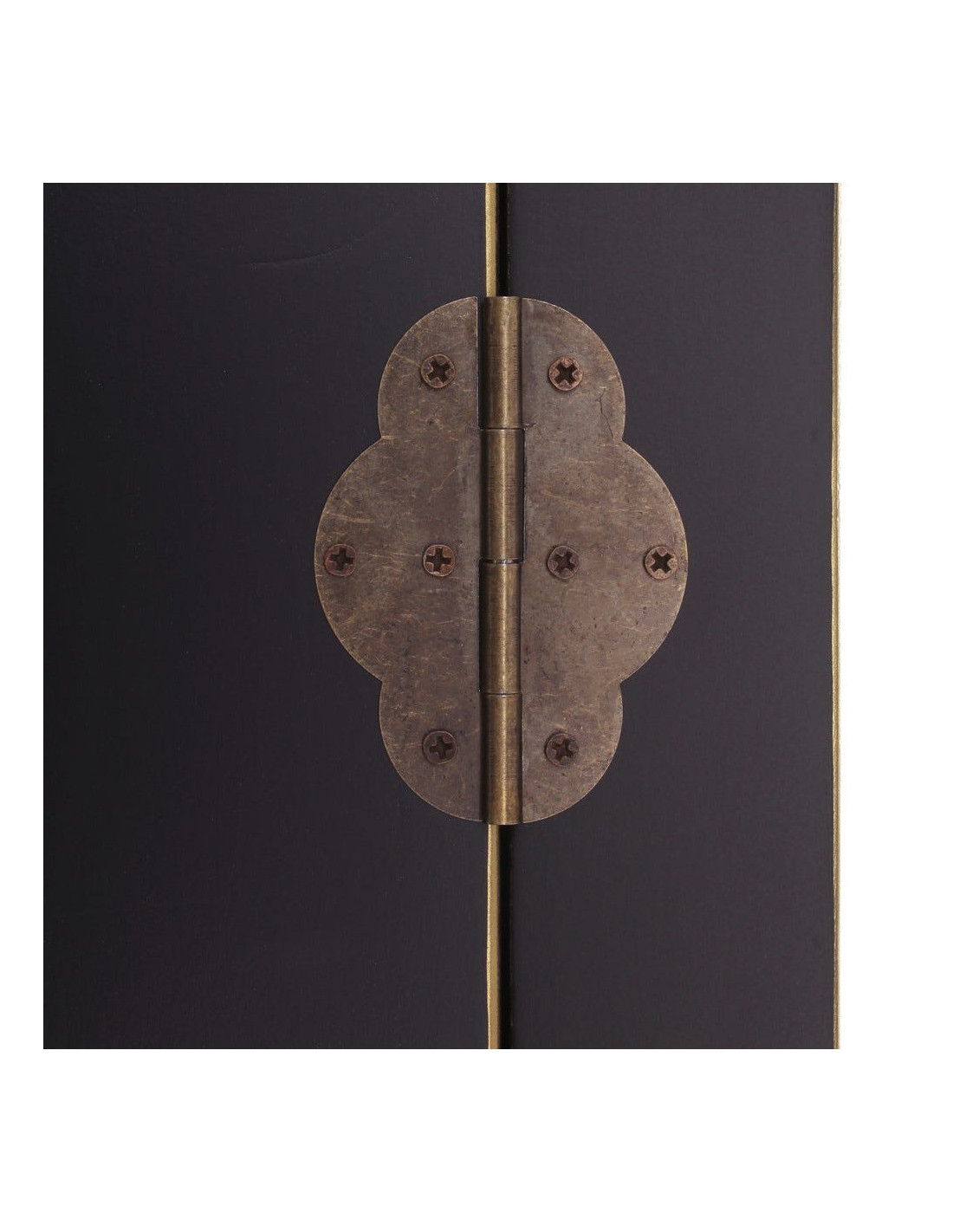 Structure en bois avec finition noire. Éléments décoratifs, poignées et ferrures en métal à finition dorée patinée, apportant relief et authenticité.