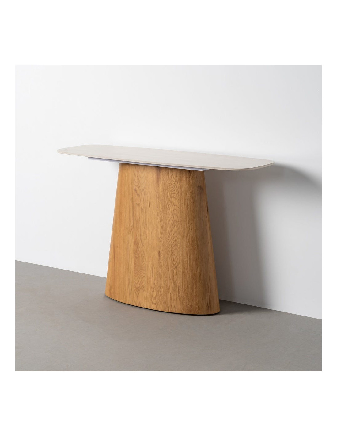 L'association du beige et du naturel fonctionne avec évidence. La partie supérieure apporte une note douce et minérale, tandis que la base au rendu bois introduit une chaleur visuelle plus enveloppante. Cette console convient particulièrement aux intérieurs qui aiment les lignes sobres, mais refusent les meubles trop froids.