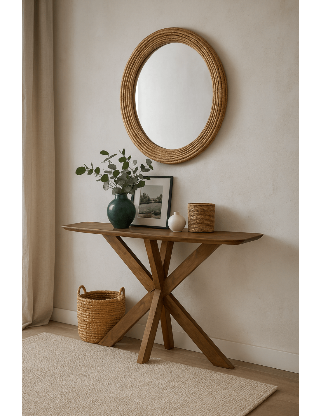 Placée sous un miroir rond, entre deux appliques ou le long d’un mur, elle devient la signature visuelle de l’entrée. Dans le salon, elle se place derrière un canapé ou sous un cadre photo grand format.
