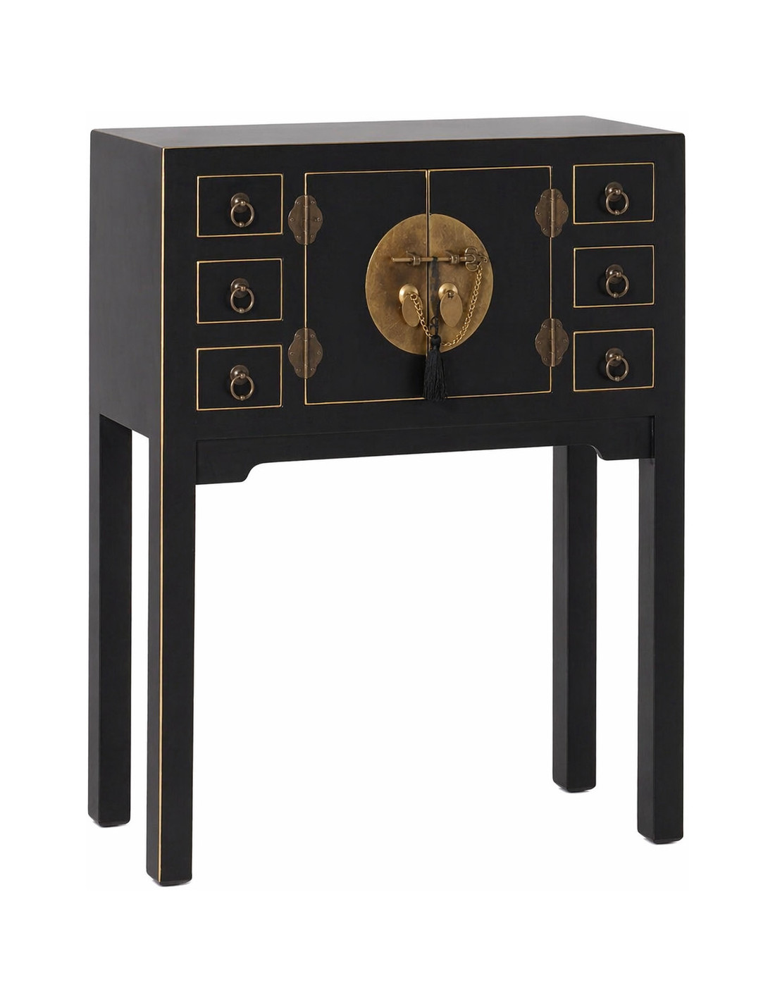 Fine et élancée, cette console apporte immédiatement du caractère à votre intérieur. Sa teinte noire profonde crée une base élégante, tandis que ses lignes dorées dessinent une façade graphique et parfaitement équilibrée. Elle attire le regard sans jamais surcharger.