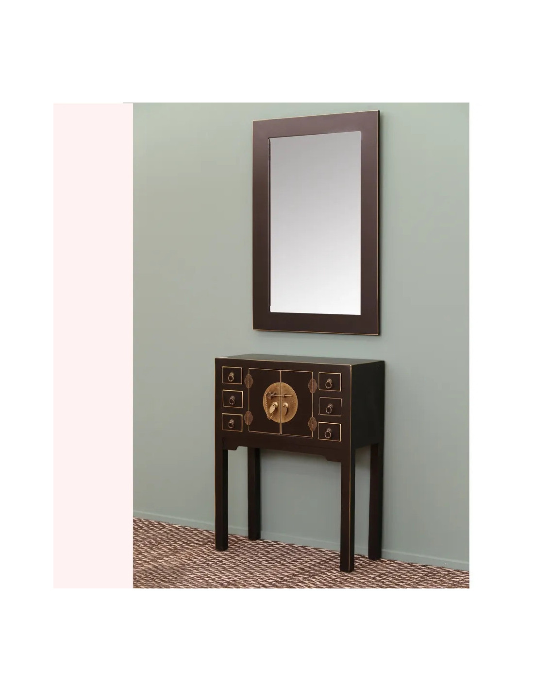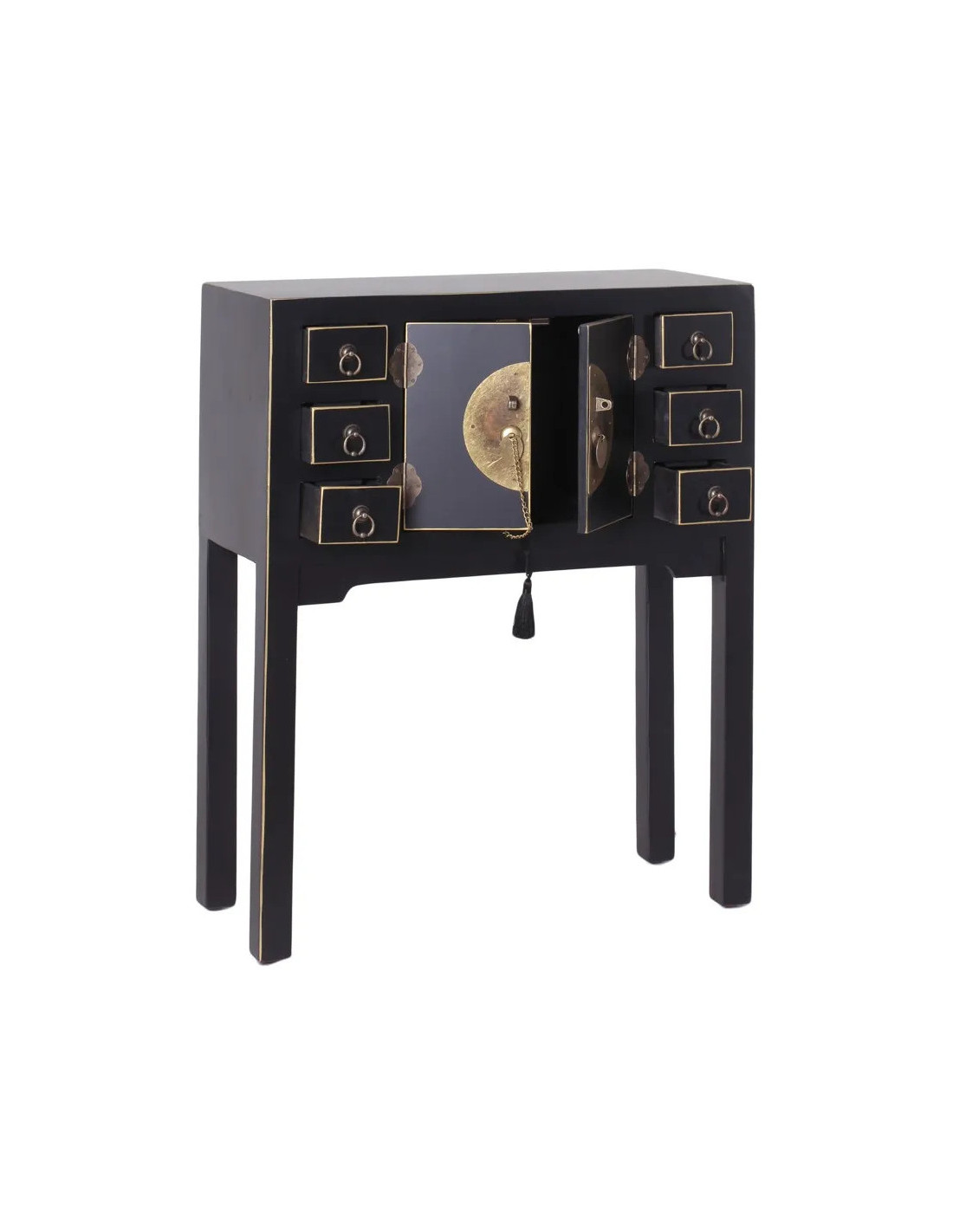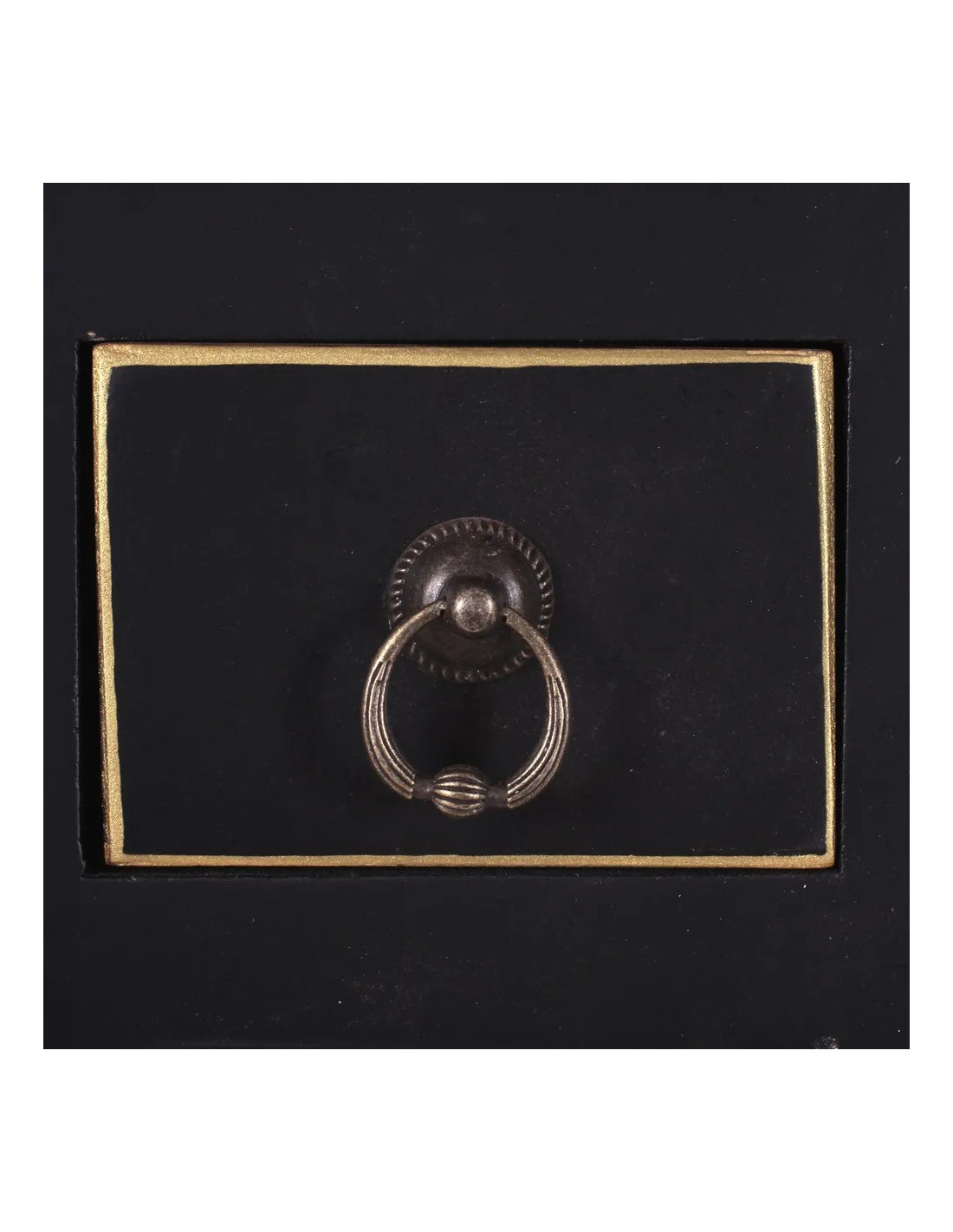 Structure en bois avec finition noire profonde. Éléments décoratifs, poignées et ferrures en métal à finition dorée patinée, apportant contraste et caractère.