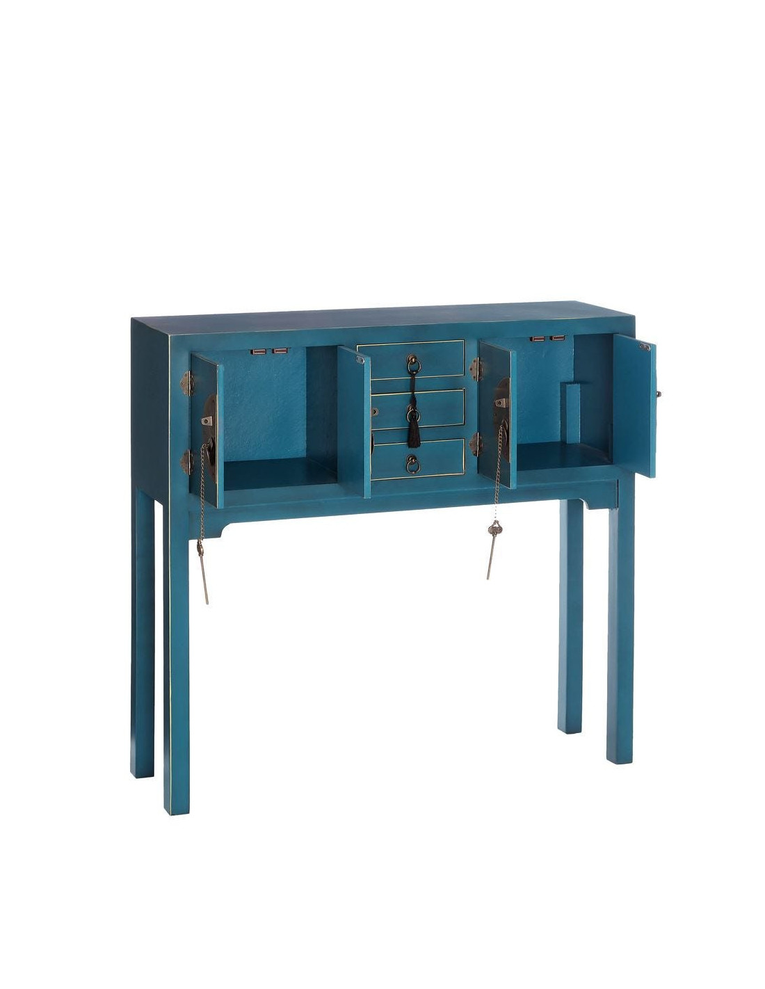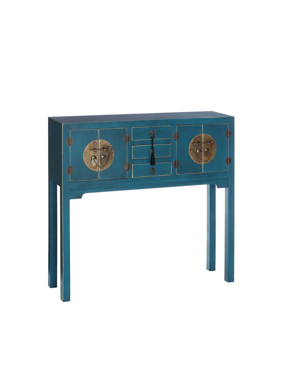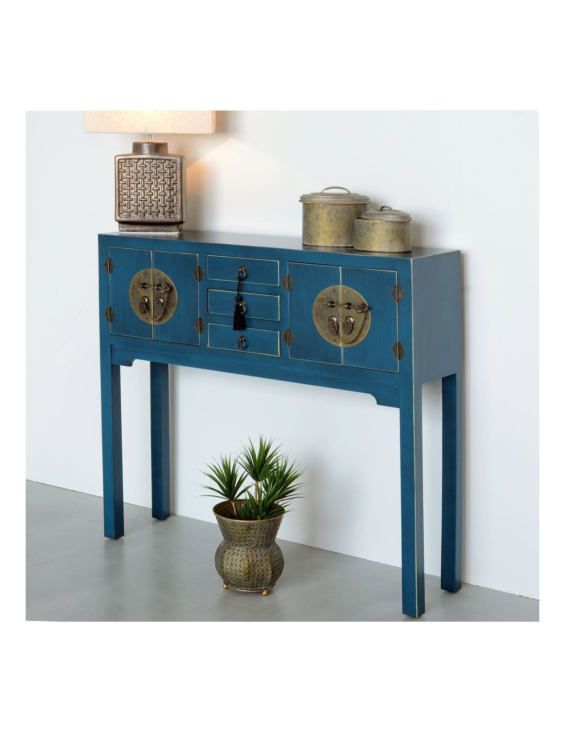 Avec sa teinte bleue profonde et ses ferrures métalliques inspirées du mobilier oriental, cette console attire immédiatement le regard. Elle structure l’espace tout en apportant une signature décorative marquée.