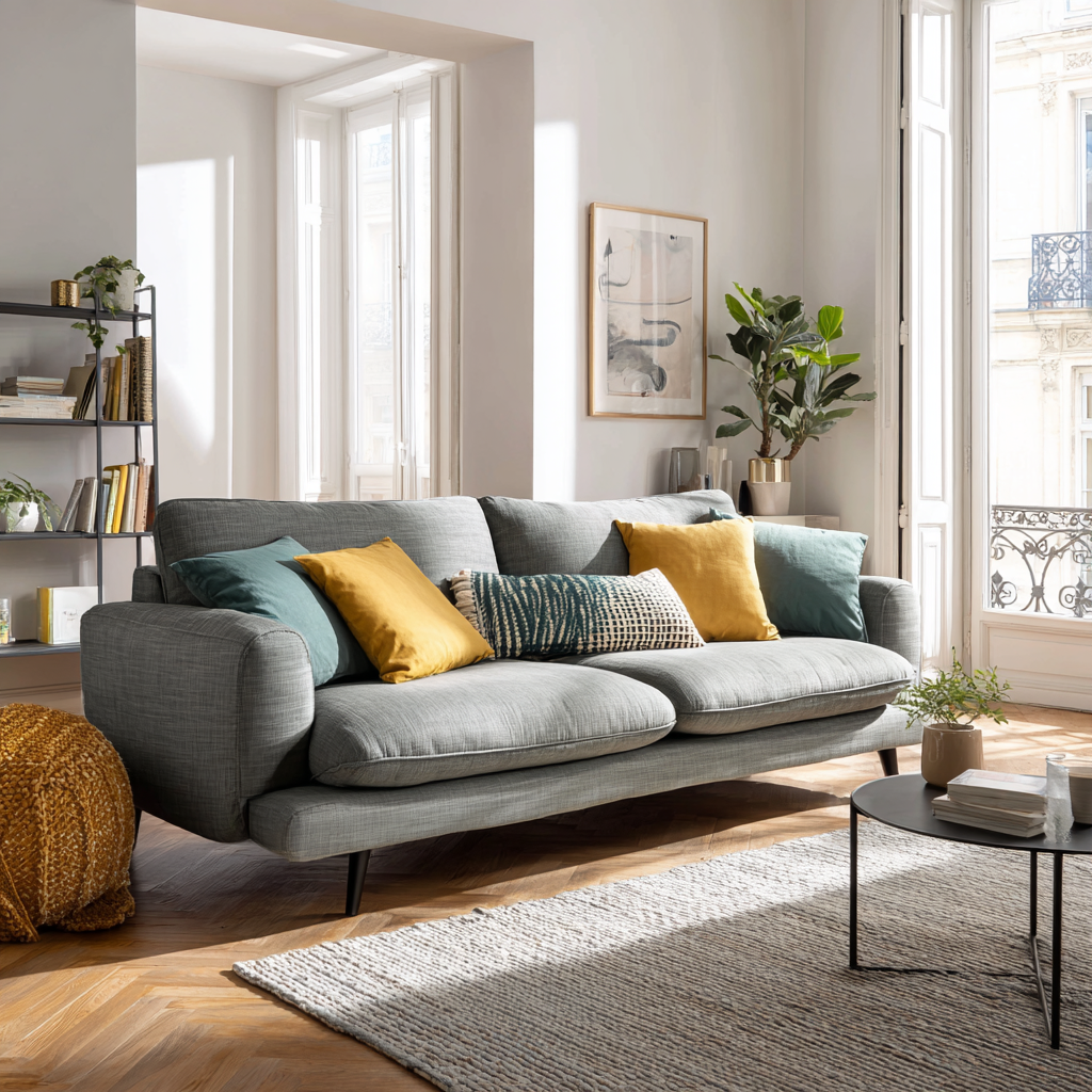 Réponse : Privilégiez les couleurs claires (gris clair, beige, blanc cassé) qui agrandissent visuellement l'espace. Évitez les couleurs trop sombres qui rétrécissent la pièce. Si vous aimez les couleurs audacieuses, optez pour un canapé minimaliste aux lignes épurées, qui prend moins de place visuellement.
