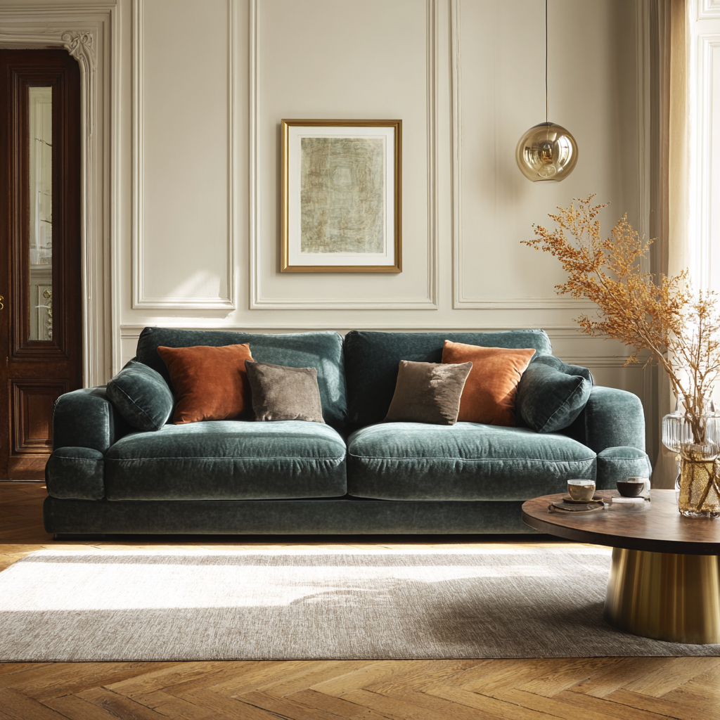 Le velours revient en force en 2025-2026, mais pas le velours lourd et étouffant des années 2000. C'est un velours léger, luxueux et sophistiqué qui apporte une touche d'élégance à votre salon.