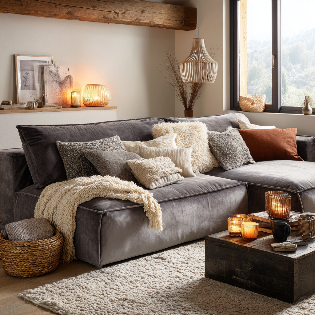 - Accessoires : Plaids moelleux, coussins épais, éclairage doux, bougies