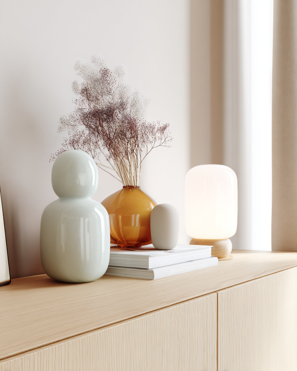 Ces compositions sont souvent compactes, presque comme de petites "scènes" Elles attirent l’œil sans saturer la pièce. Elles invitent à regarder de plus près, à remarquer la texture d’un objet, la lumière qui traverse un verre, l’association des couleurs. Elles fonctionnent particulièrement bien sur les surfaces qui ont besoin d’un peu de rythme : buffets, étagères, consoles, tables basses.