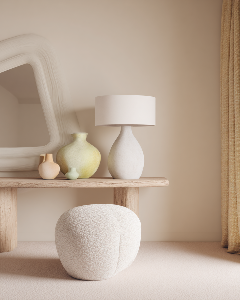 • Sur une console, un vase twisté dans une teinte pop feutrée introduit un clin d’œil discret mais expressif.