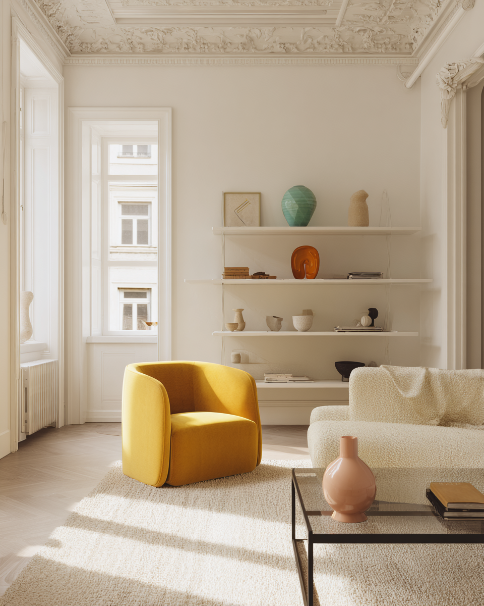 • Dans un salon aux tons neutres, un fauteuil jaune solaire devient un véritable réveil visuel.