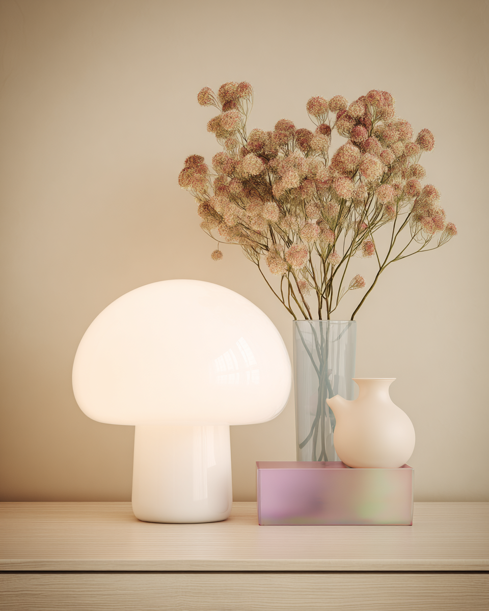 • Une lampe opaline rosée diffuse une lueur douce et crée une ambiance enveloppante idéale pour un coin salon.