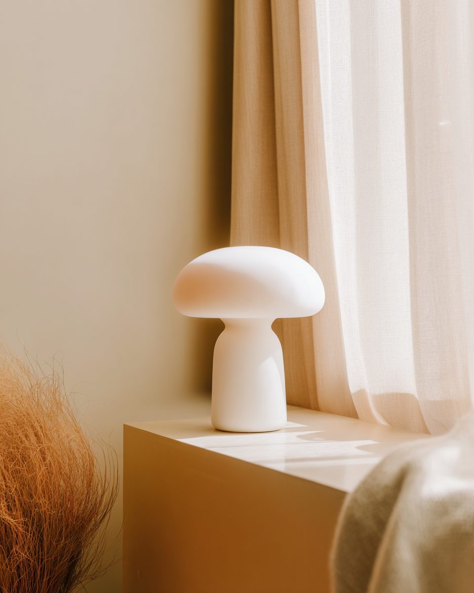• Dans le salon, une lampe champignon colorée apporte une touche vintage modernisée et devient une pièce joyeuse du décor.
