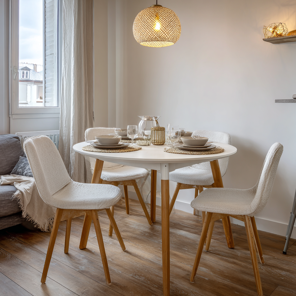 - Chaises scandinaves épurées (bois + tissu)