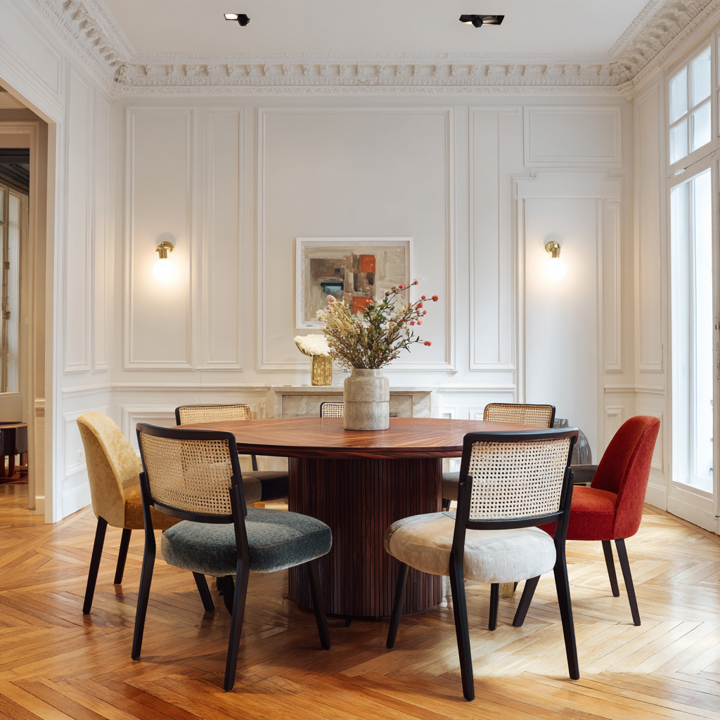 Je conseille presque toujours un diamètre légèrement plus grand que ce que l’on pense nécessaire. Beaucoup de clients sous-estiment l’espace dont ils disposent et regrettent ensuite de ne pas avoir choisi 10 cm de plus. Une table ronde bien proportionnée donne de l’air à la pièce et ne l’alourdit jamais.