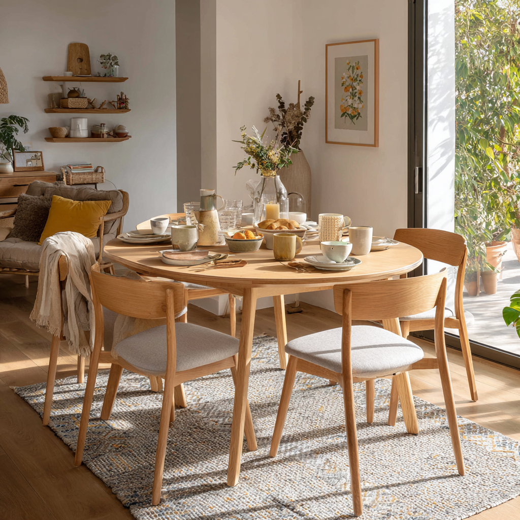 Un tapis sous la table crée une zone délimitée et ajoute du confort. Choisissez un diamètre de 150-180 cm pour que les chaises reposent partiellement sur le tapis.