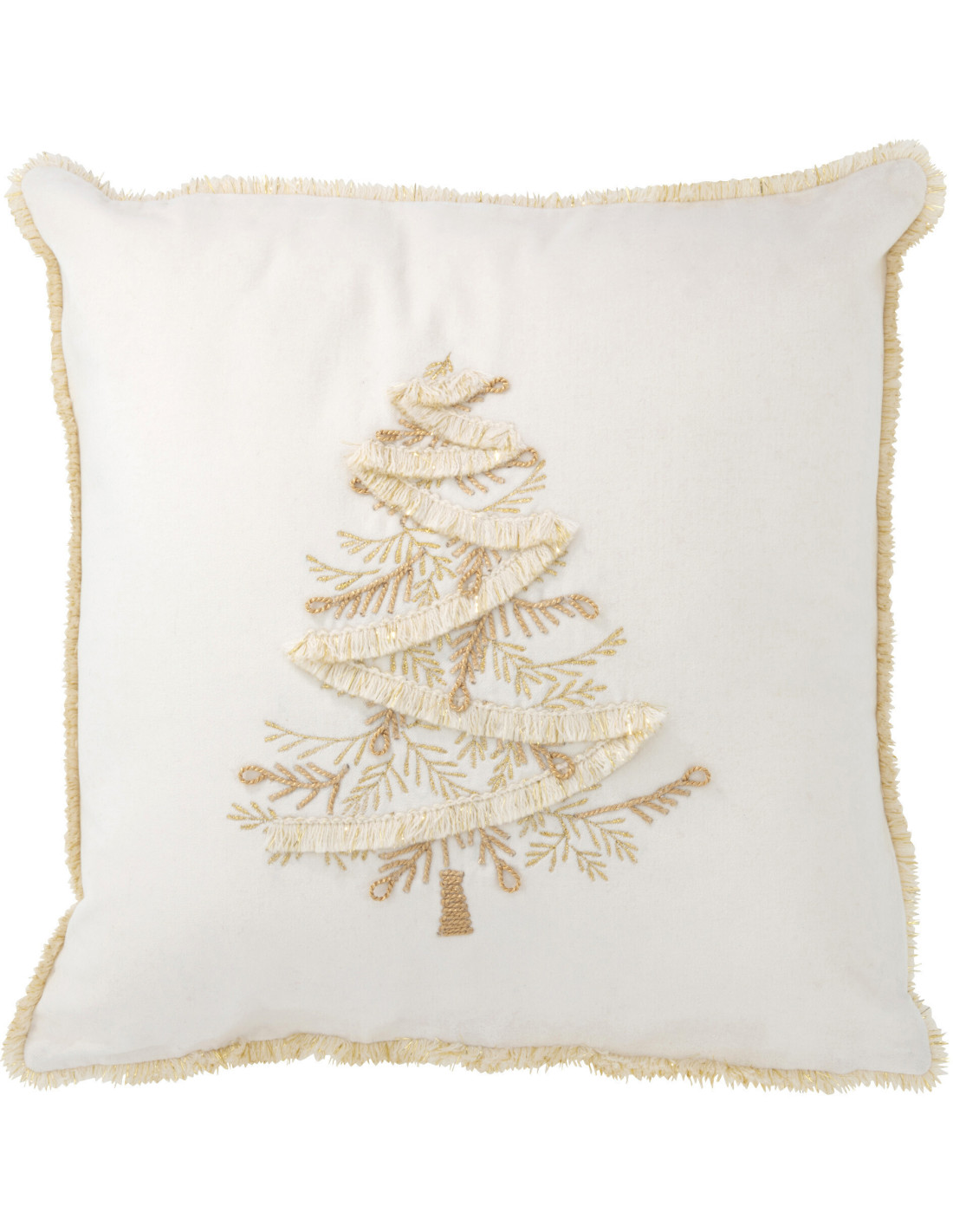 Coussin Carré Festive 45x45 en Polyester Blanc Doré Motif Sapin de Noël Avec franges
