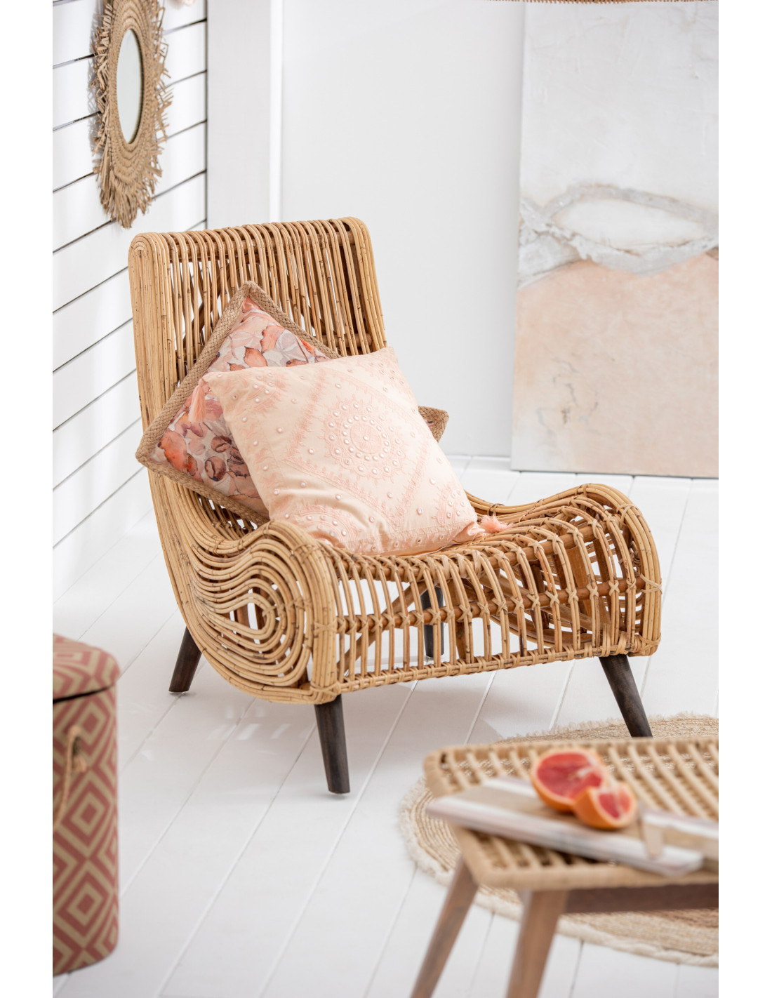 Coussin Carré Ibiza 50x50 en Coton Pamplemousse Motif géométrique Avec pompons