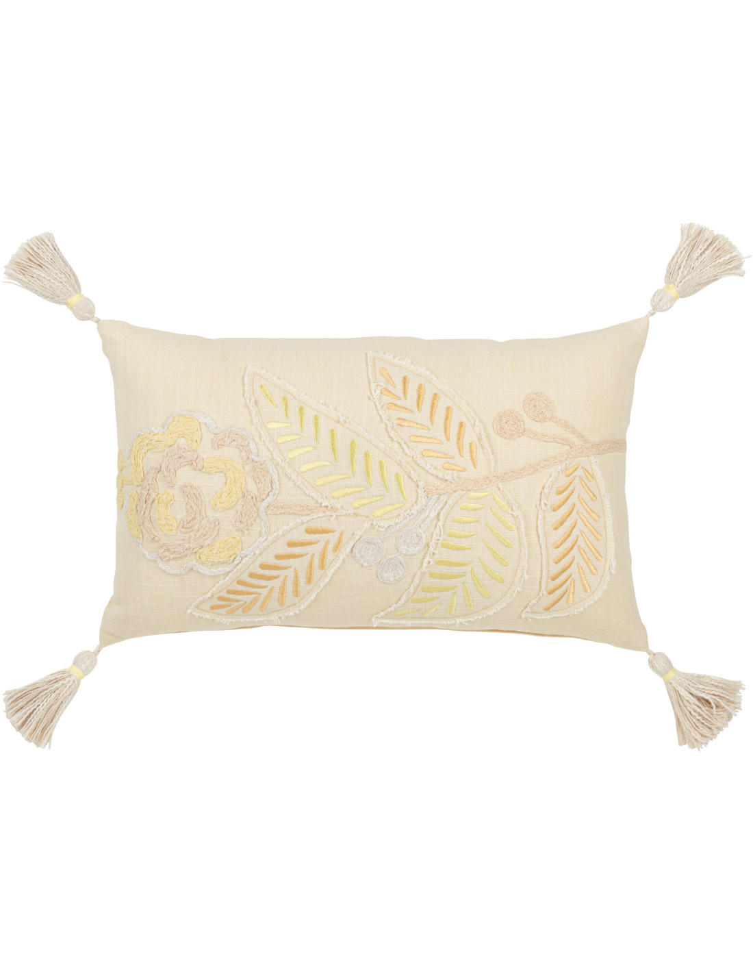 Coussin Rectangulaire 50x30 en Coton Beige Jaune avec pompons Motif fleur Fleurio