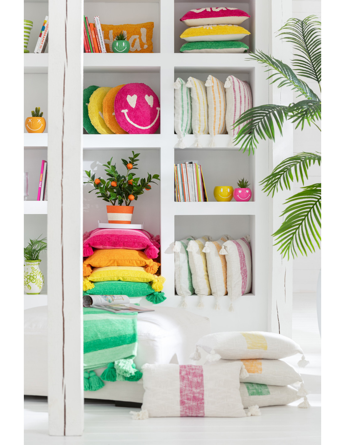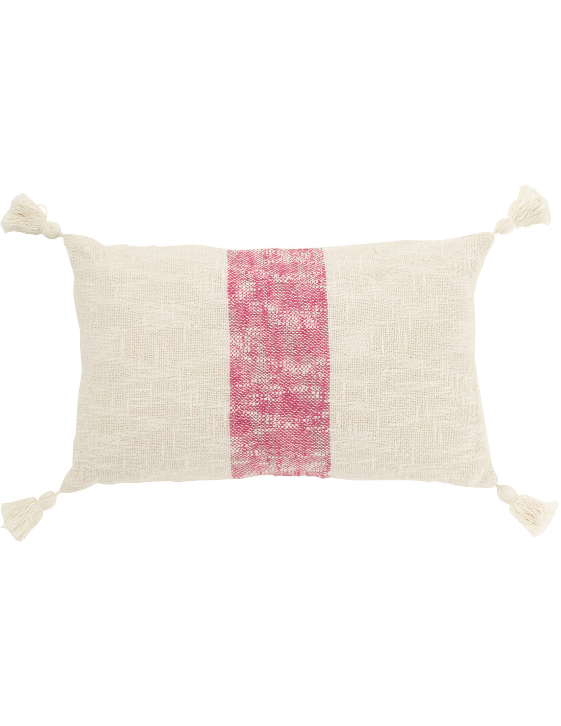 Un équilibre parfait entre douceur et caractère. Ce coussin rectangulaire joue sur une bande centrale rose pour structurer l'ensemble avec subtilité.