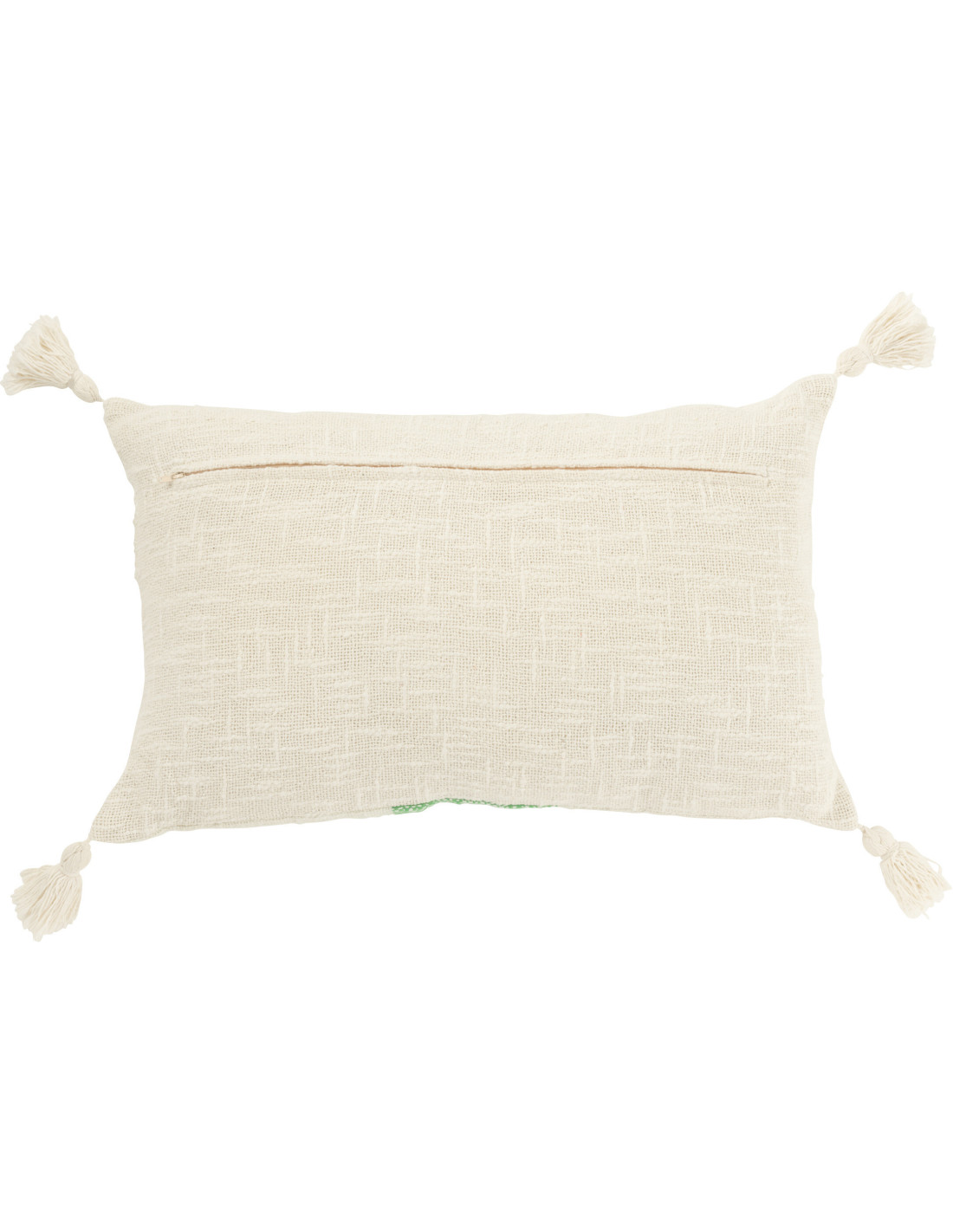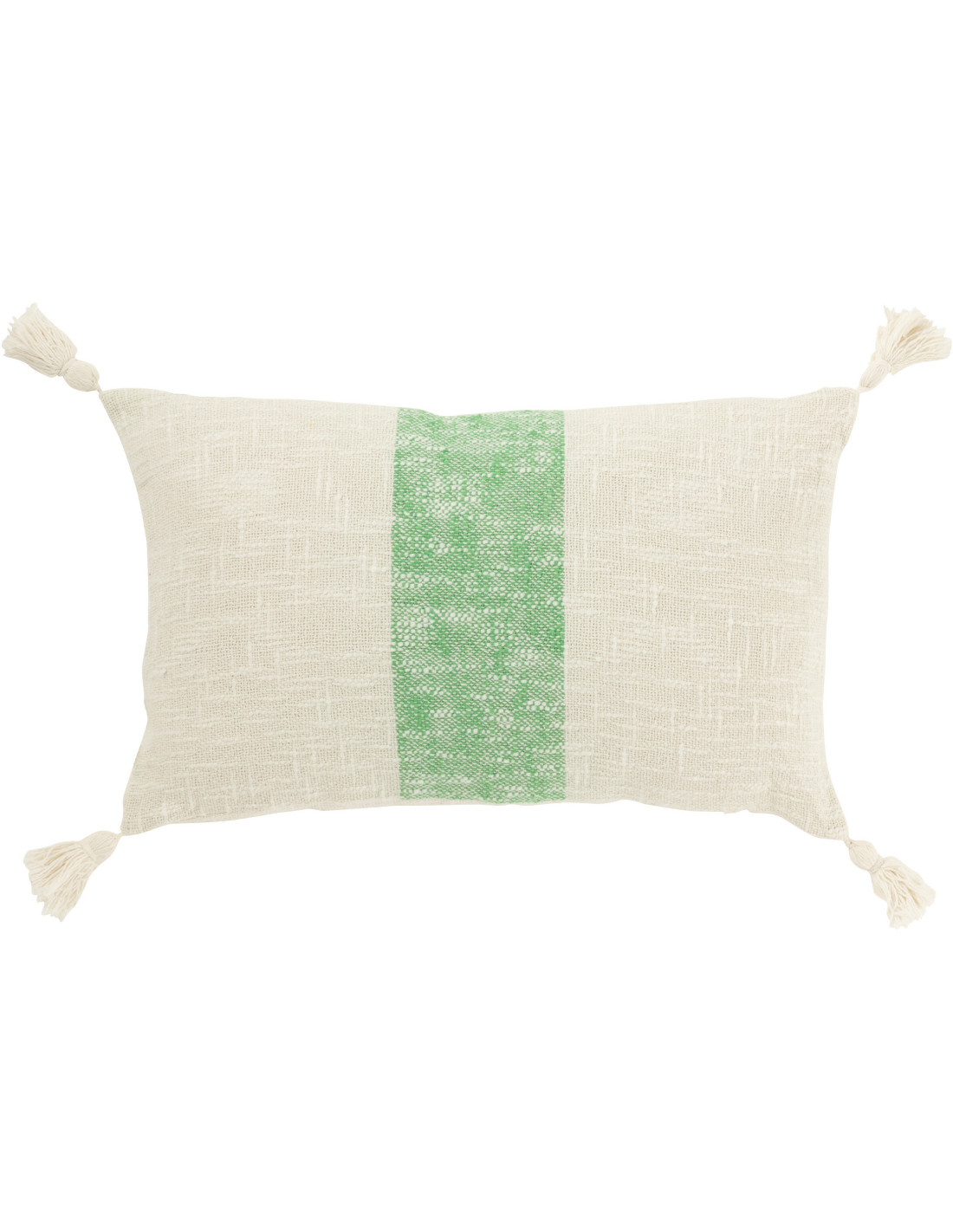Ce coussin se distingue par sa bande centrale verte légèrement texturée. Elle apporte du relief et structure visuellement l'ensemble sans alourdir la composition.