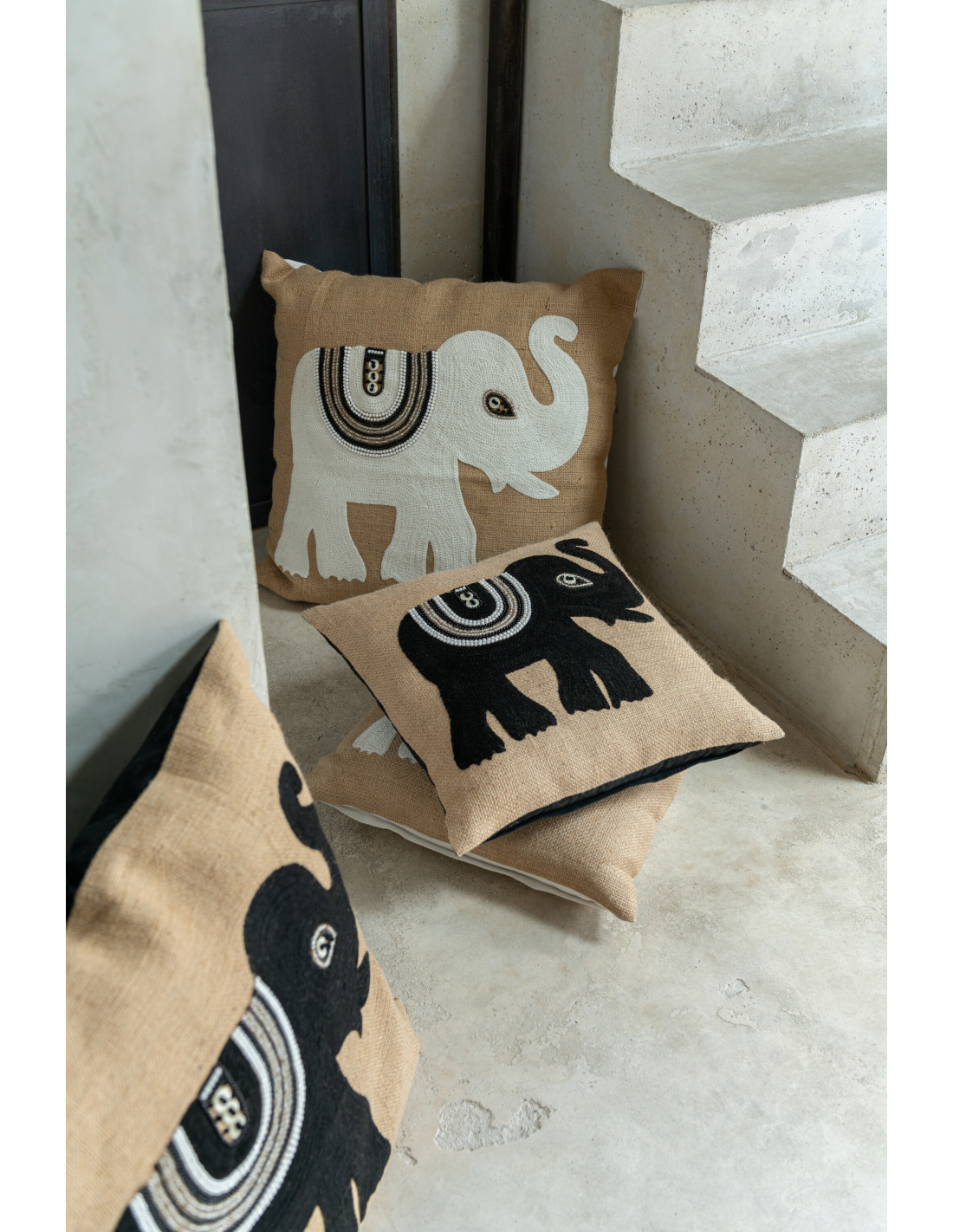 Coussin XL Carré Krombe 60x60 en Jute Beige Blanc Motif éléphant - 1