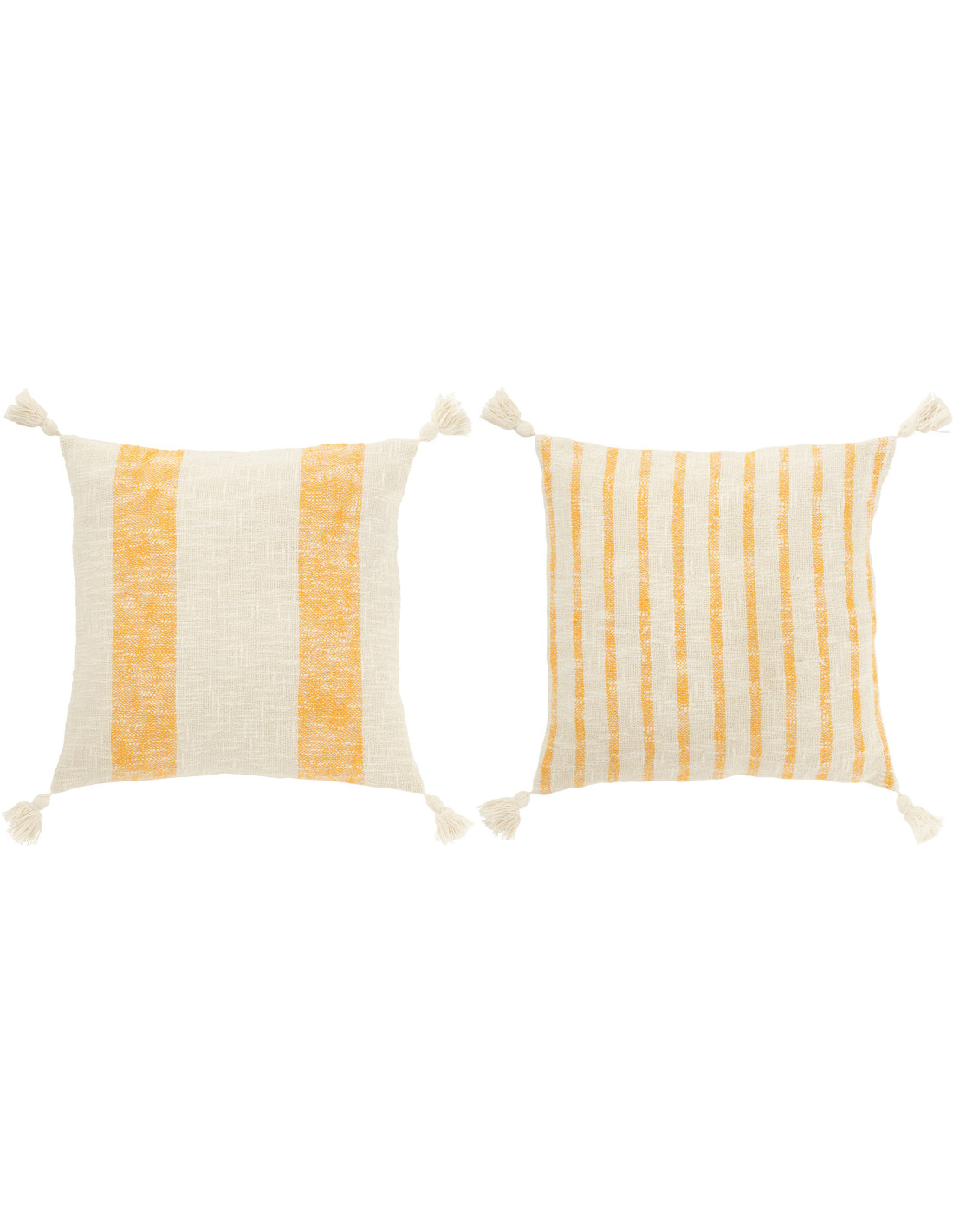 Ce lot de deux coussins joue sur la complémentarité des motifs. L'un affiche des bandes verticales marquées, l'autre un rythme plus régulier. Ensemble, ils créent une composition visuelle équilibrée et dynamique.