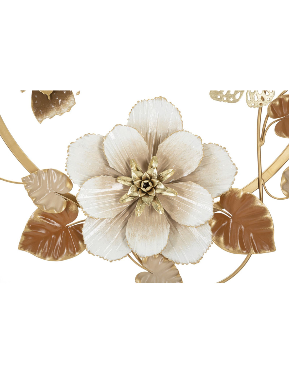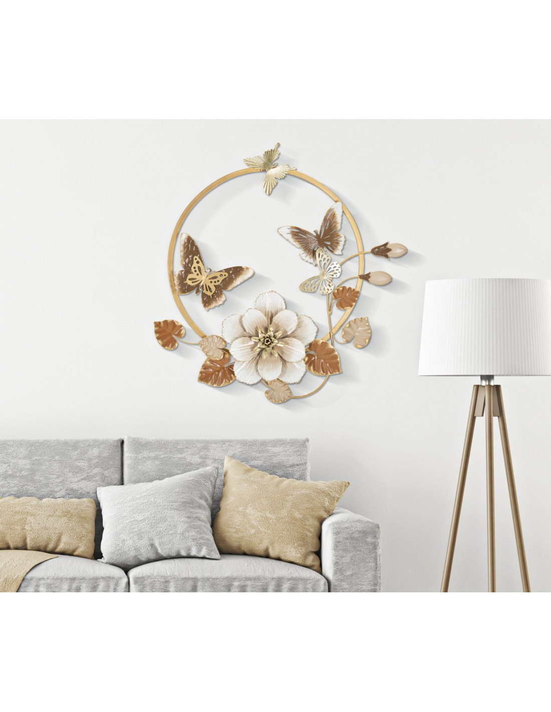 Décoration murale design Papillons Fleurs Feuilles Métal Doré Blanc crème Marron Rouns H 63 cm