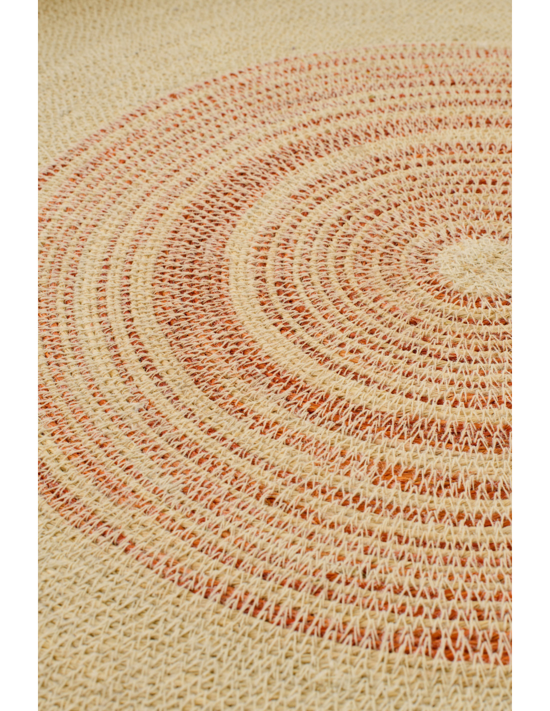 Avec son motif concentrique en terracotta, cette pièce attire immédiatement l’attention. Elle crée un point d’ancrage visuel tout en conservant une grande douceur.