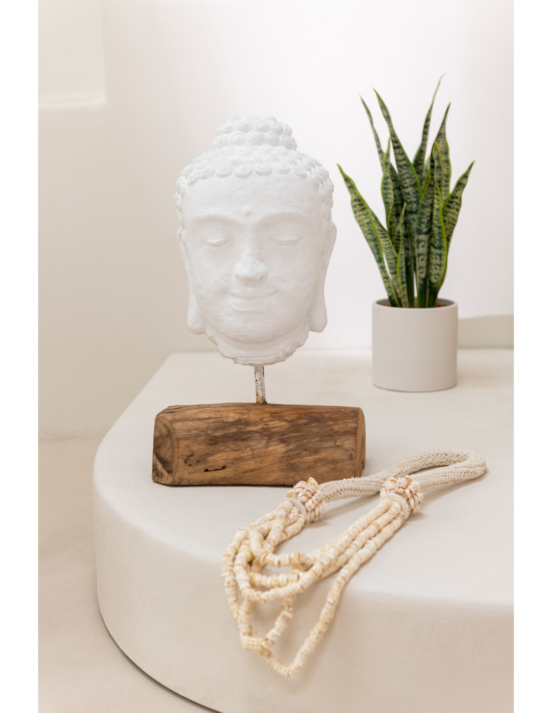 Décoration sur pied Tête de bouddha Hauteur 45 cm en Ciment Blanc Bois de teck Naturel Elna