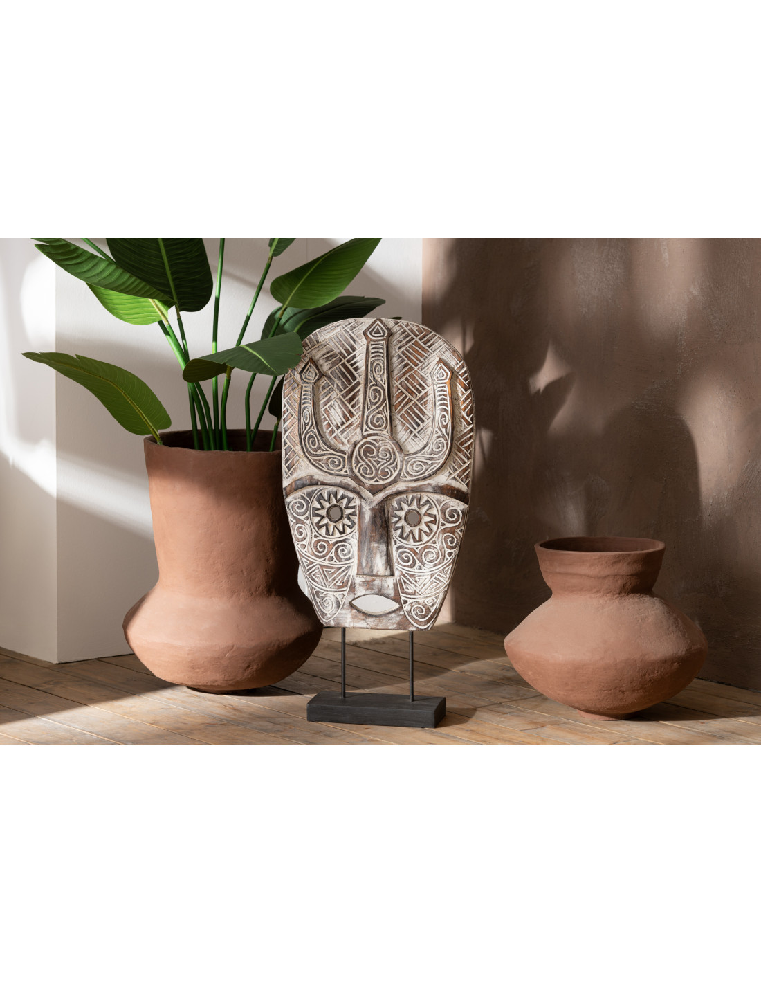 Décoration sur pied XL Masque ethnique Hauteur 80 cm en Bois d'albasia Naturel Zihao
