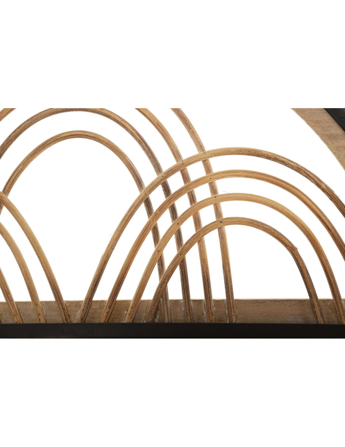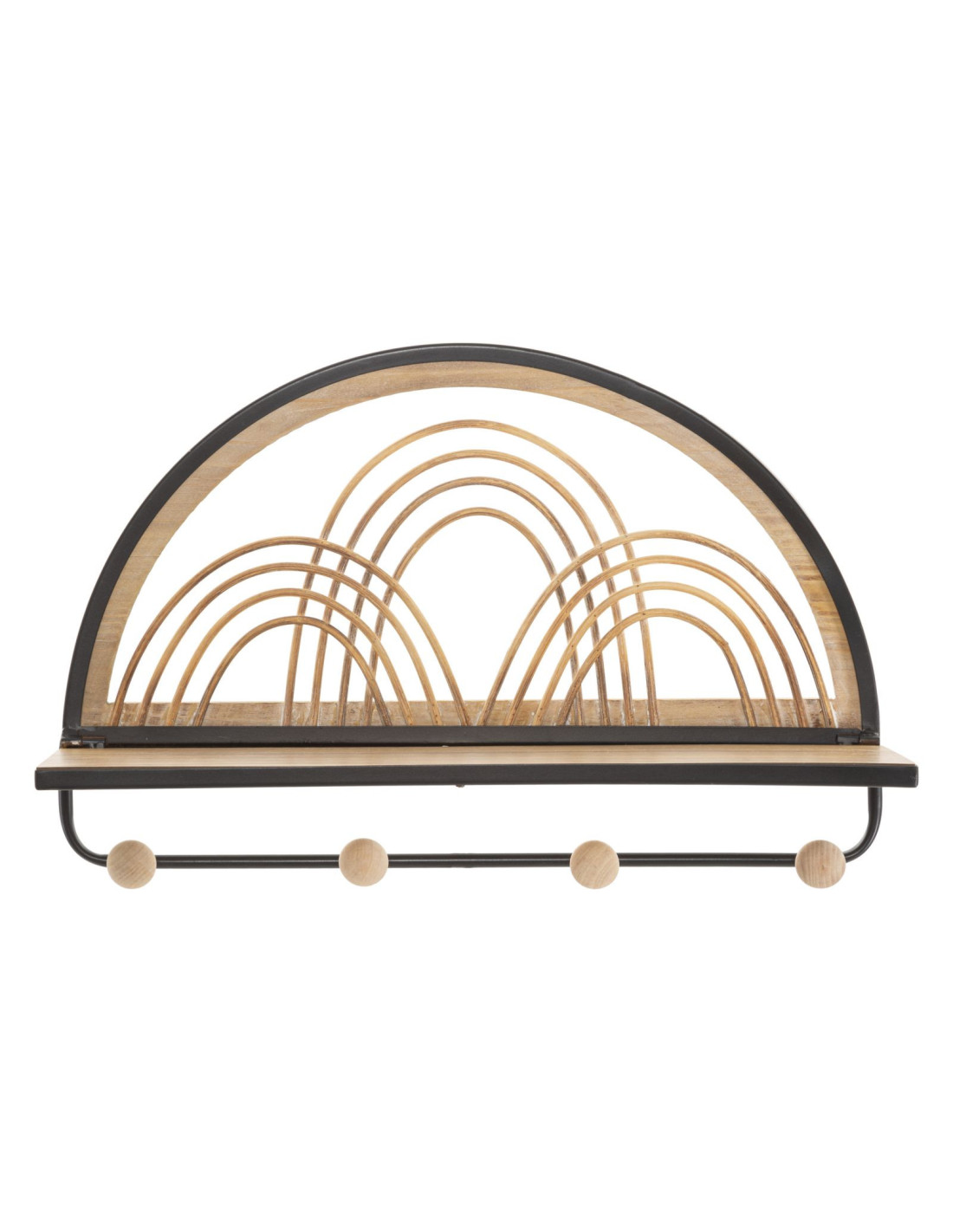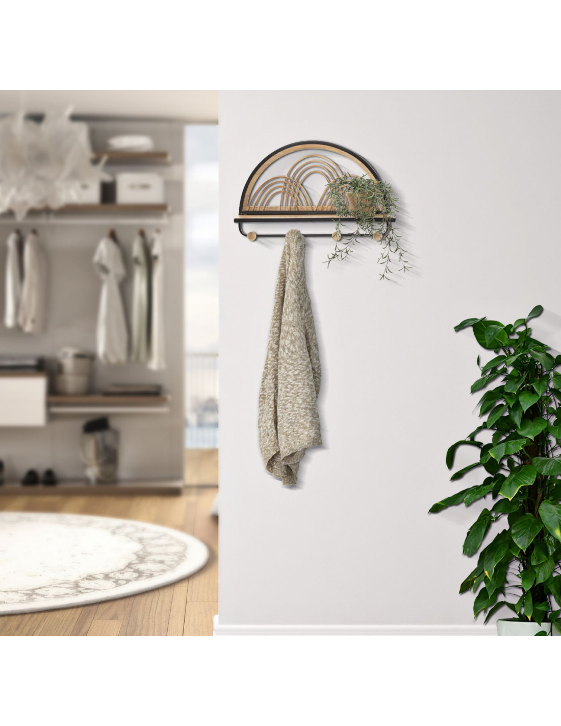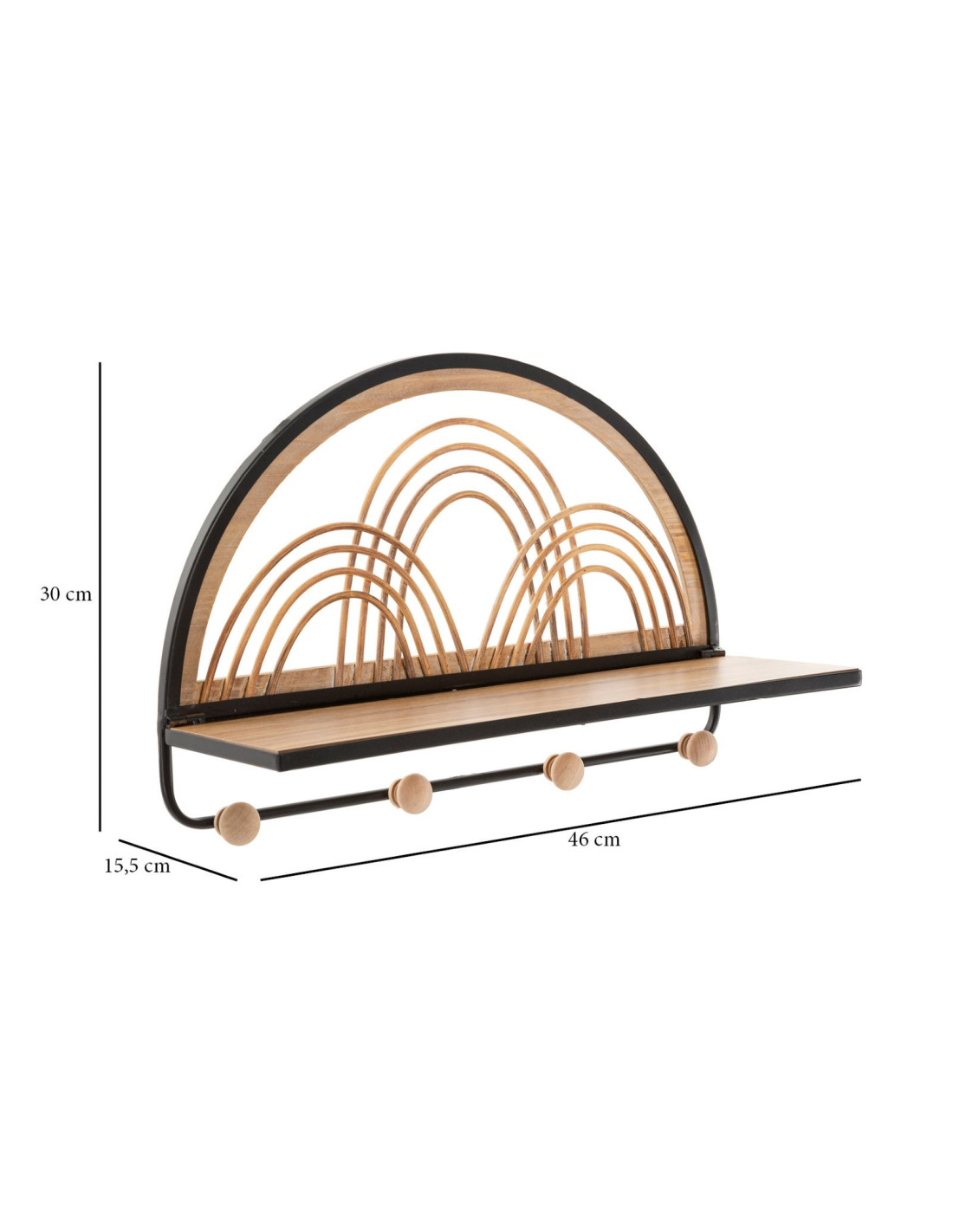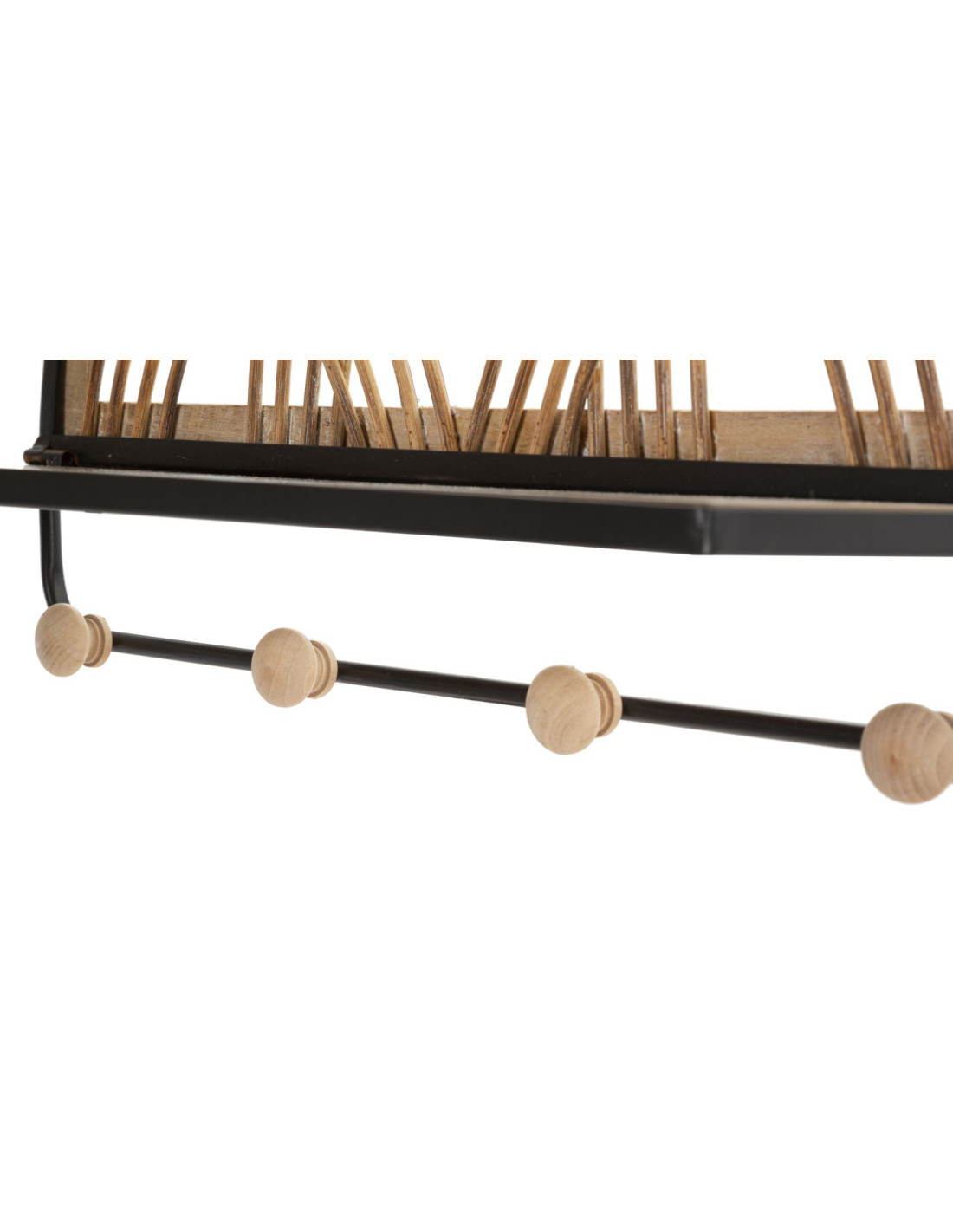 Étagère murale d'entrée porte manteau 4 crochets Rotin Naturel Métal Noir Bois MDF Oporto 46 cm